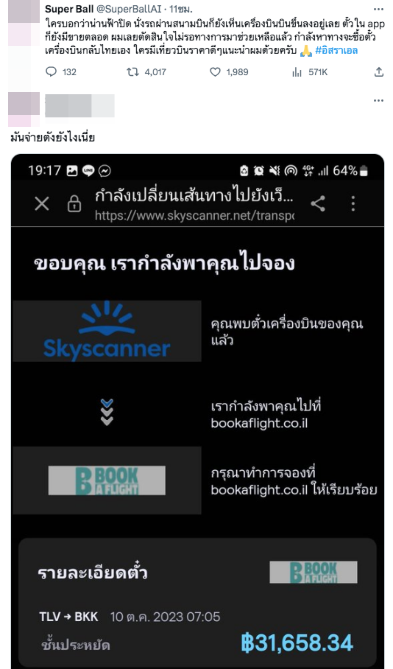 นอกจากนี้ได้โพสต์ภาพจองตั๋วเครื่องบินจากท่าอากาศยานนานาชาติเบนกูเรียน อิสราเอล มายังกรุงเทพฯ ประเทศไทย ราคาประมาณ 3 หมื่นบาท พร้อมระบุข้อความว่า "จ่ายตังค์ยังไงเนี่ย" ทำให้มีคนเข้ามาแสดงความคิดเห็นจำนวนมาก