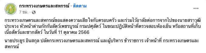 ต่อมา ทางเพจเฟซบุ๊ก กรมปศุสัตว์ กระทรวงเกษตรและสหกรณ์ หน่วยงานที่เกี่ยวข้อง ลูกน้องและครอบครัวผู้เสียชีวิต รวมถึงคนในโลกโซเชียล ต่างก็โพสต์ข้อความเพื่อแสดงความเสียใจกับครอบครัว และอาลัยกับการสูญเสียครั้งนี้เป็นจำนวนมาก