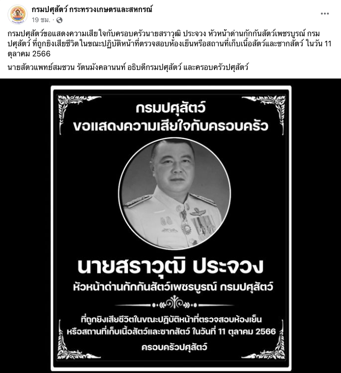 วันที่ 12 ตุลาคม 2566 จากกรณีที่นายสราวุฒิ ประจวง อายุ 50 ปี ตำแหน่งนายสัตวแพทย์ชำนาญการ หัวหน้าด่านกักสัตว์เพชรบูรณ์ ถูกนายอนุสรณ์ ดอนสวรรค์ หรือ เสี่ยณุ อายุ 57 ปี ใช้อาวุธปืนขนาด 9 มม. กระหน่ำยิง 5 นัดเสียชีวิต ขณะปฏิบัติหน้าที่ตรวจค้นบ้านของนายอนุสรณ์ ในพื้นที่หมู่ 1 ต.ช้างตะลูด อ.หล่มสัก จ.เพชรบูรณ์ ซึ่งเป็นอาคารห้องเย็นขนาดใหญ่ พร้อมอาคารที่พักอาศัย และบางส่วนกำลังก่อสร้างเป็นโรงฆ่าสัตว์