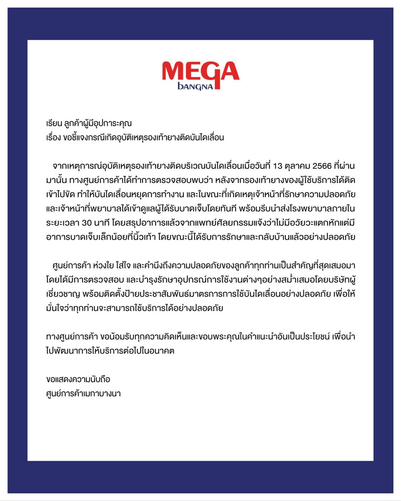 ล่าสุด ศูนย์การค้าเมกาบางนา ขอชี้แจงกรณีเกิดอุบัติเหตุรองเท้ายางติดบันไดเลื่อน โดยระบุว่า จากเหตุการณ์อุบัติเหตุรองเท้ายางติดบริเวณบันไดเลื่อนเมื่อวันที่ 13 ตุลาคม 2566 ที่ผ่านมานั้น