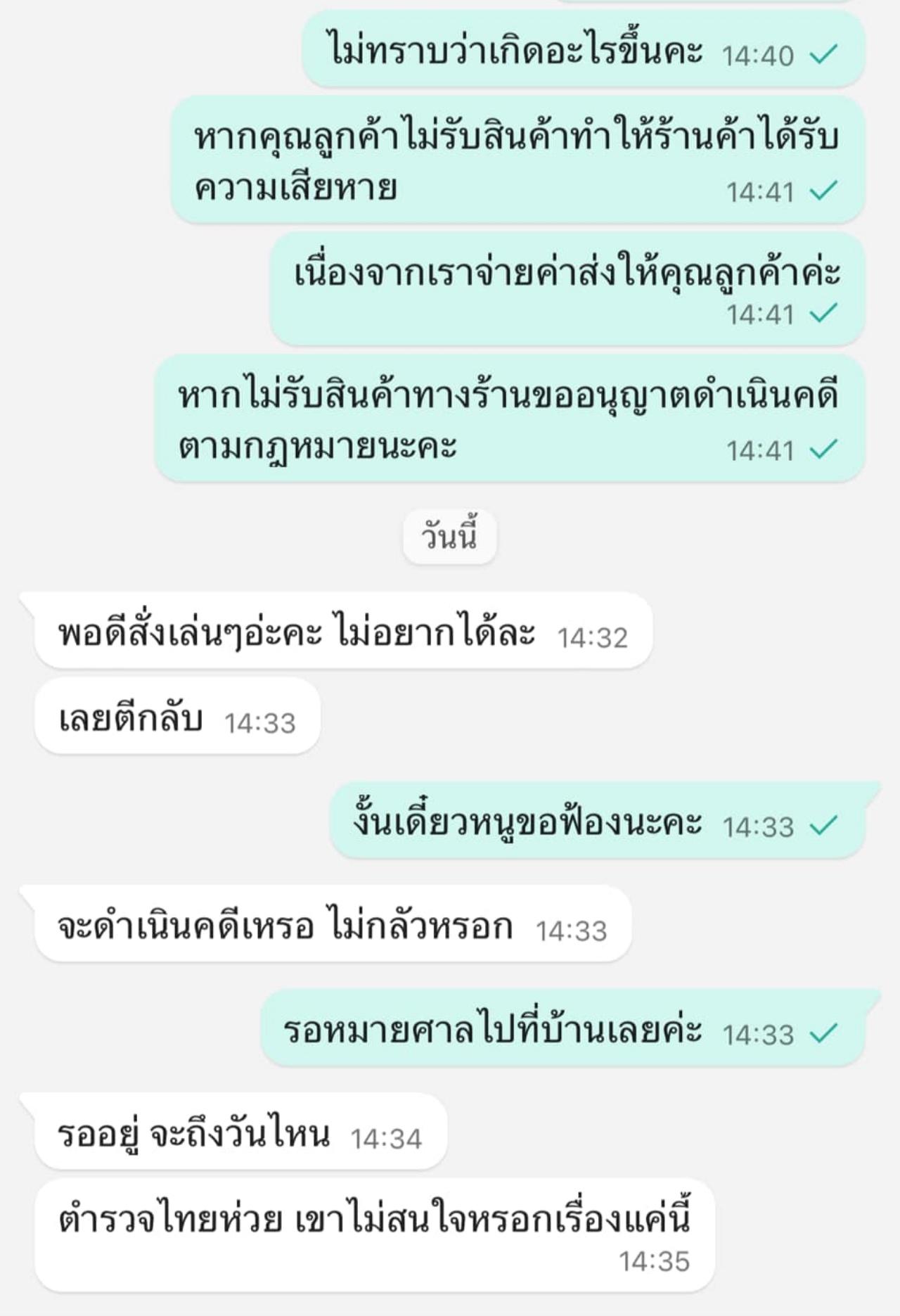 โดยในภาพแชตที่เธอคุยกับลูกค้าในแอปฯ ขายสินค้าออนไลน์นั้น ก็พยายามสอบถามเหตุผล ที่ลูกค้าไม่รับของ และบอกว่าหากไม่รับ ทำให้ร้านเสียหาย จะแจ้งความดำเนินคดี ซึ่งทางลูกค้าก็ตอบกลับมาว่า "พอดีสั่งเล่นๆ ไม่อยากได้ละ เลยตีกลับ"