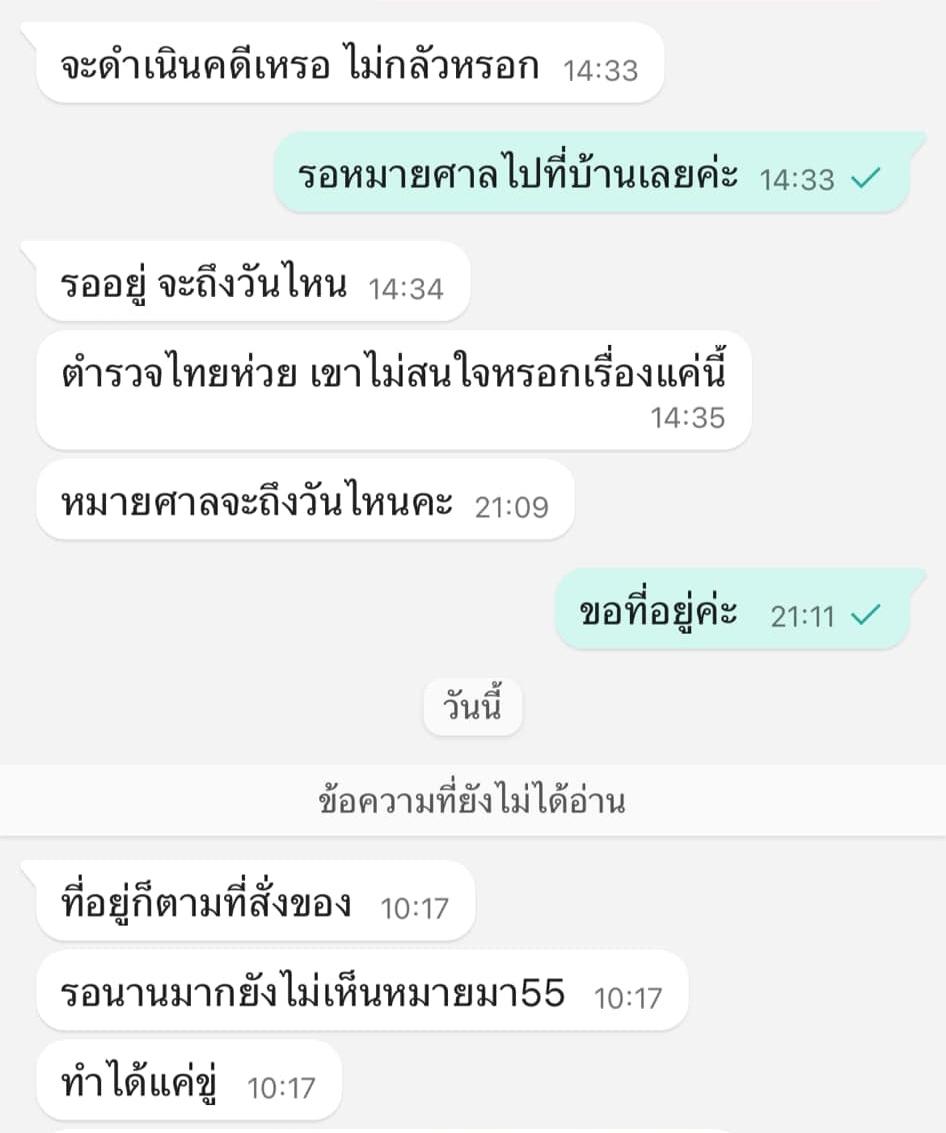 แถมท้าให้ดำเนินคดีได้เลยไม่กลัว และในวันต่อมา ยังทักไปบอกแม่ค้าอีกว่า "ที่อยู่ก็ตามที่สั่งของ รอนานมากยังไม่เห็นหมายมา ทำได้แค่ขู่"