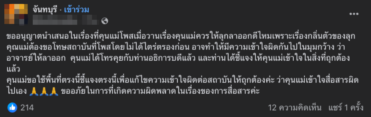 คุณแม่ต้องขอโทษสถาบัน ที่โพสต์โดยไม่ได้ไตร่ตรองก่อน อาจทำให้มีความเข้าใจผิดกันไปในมุมกว้าง ว่าอาจารย์ให้ลาออก คุณแม่ได้โทรคุยกับท่านอธิการบดีแล้ว และท่านได้ชี้แจงให้คุณแม่เข้าใจในสิ่งที่ถูกต้องแล้ว