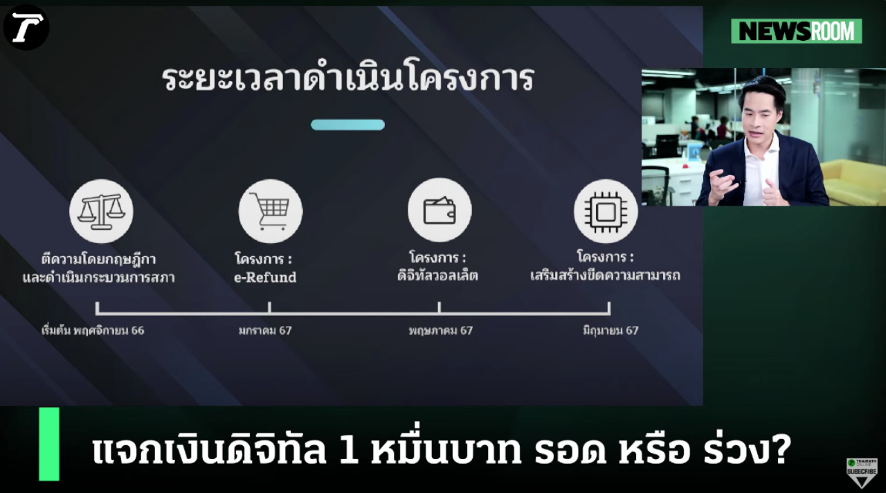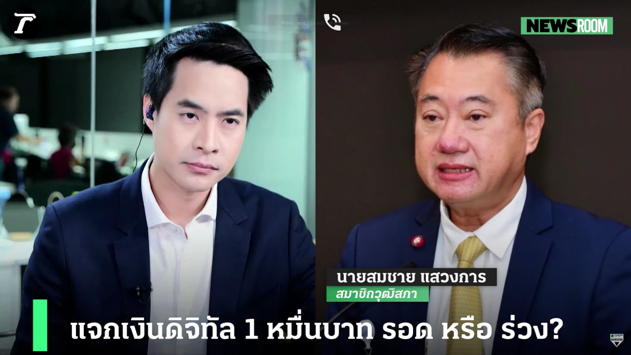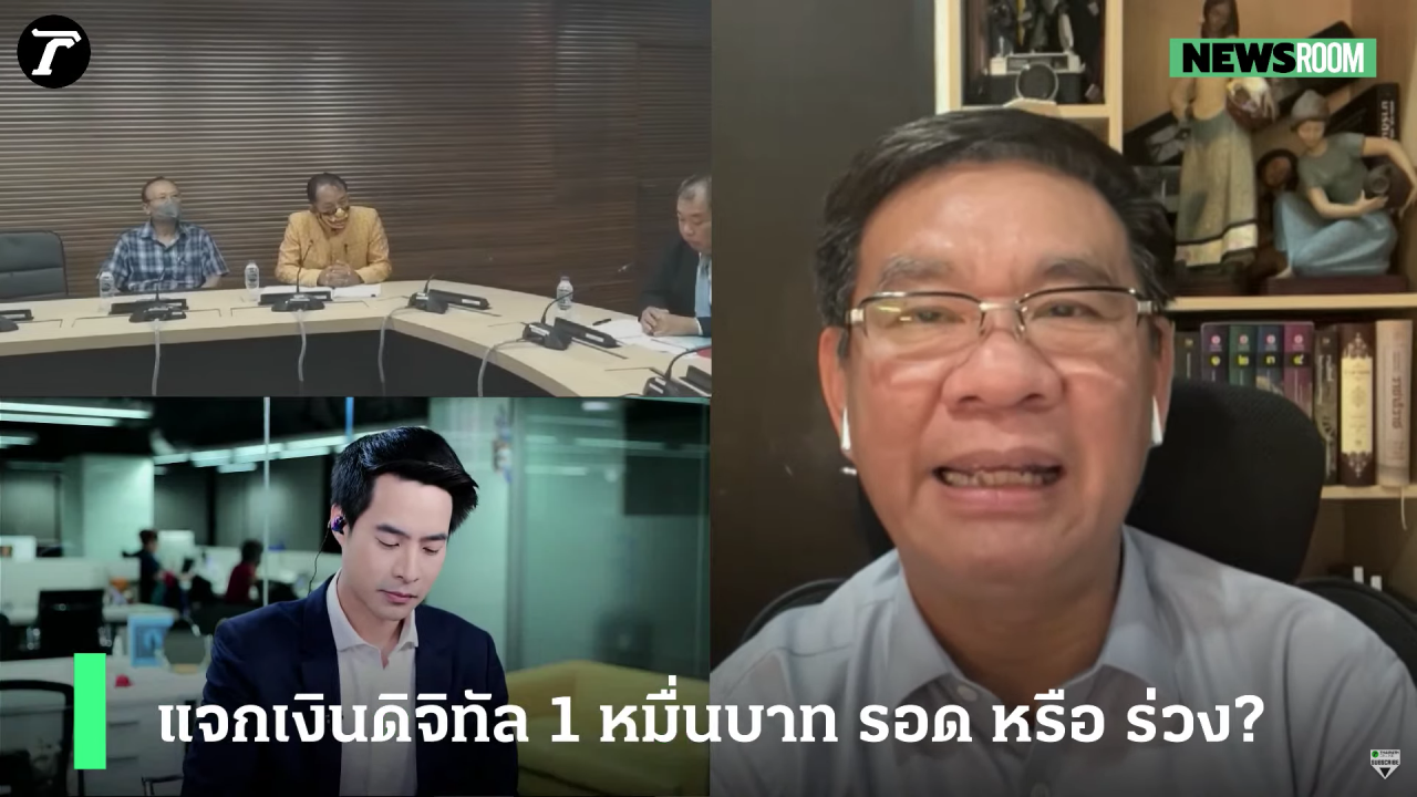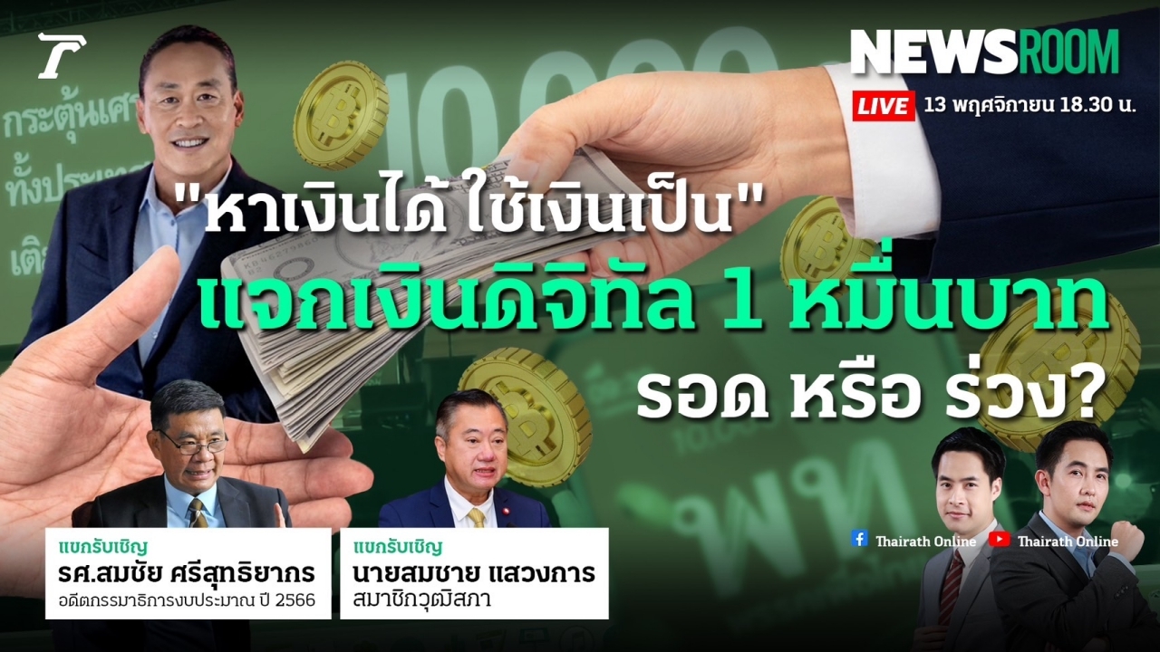 วันที่ 13 พฤศจิกายน 2566 ในรายการ NewsRoom วันนี้ เป็นการพูดคุยถึงโครงการเติมเงิน 1 หมื่นบาท ผ่านดิจิทัลวอลเล็ต กับ รศ.สมชัย ศรีสุทธิยากร อดีตกรรมาธิการงบประมาณปี 2566 และ นายสมชาย แสวงการ สมาชิกวุฒิสภา ท่ามกลางความกังวลของหลายคนว่าโครงการนี้จะไปรอด หรือ ร่วง ? ขณะที่ นายเศรษฐา ทวีสิน นายกรัฐมนตรีและ รมว.คลัง มั่นใจ พรรคร่วมหนุน ดิจิทัลวอลเล็ต ลั่น "หาเงินได้ ใช้เงินเป็น"
