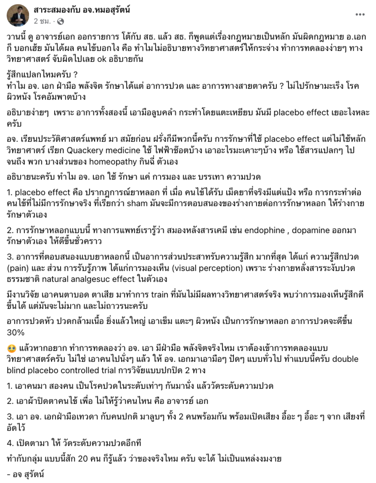 โดยระบุข้อความว่า "ทำไม อจ.เอก ฝ่ามือพลังจิต รักษาได้แต่ อาการปวด และอาการทางสายตาครับ? ไม่ไปรักษามะเร็ง โรคผิวหนัง โรคอัมพาตบ้าง อธิบายง่ายๆ เพราะอาการทั้งสองนี้ เอามือลูบคลำ กระทำโดยแตะเหยียบ มันมี placebo effect เยอะไงหละครับ