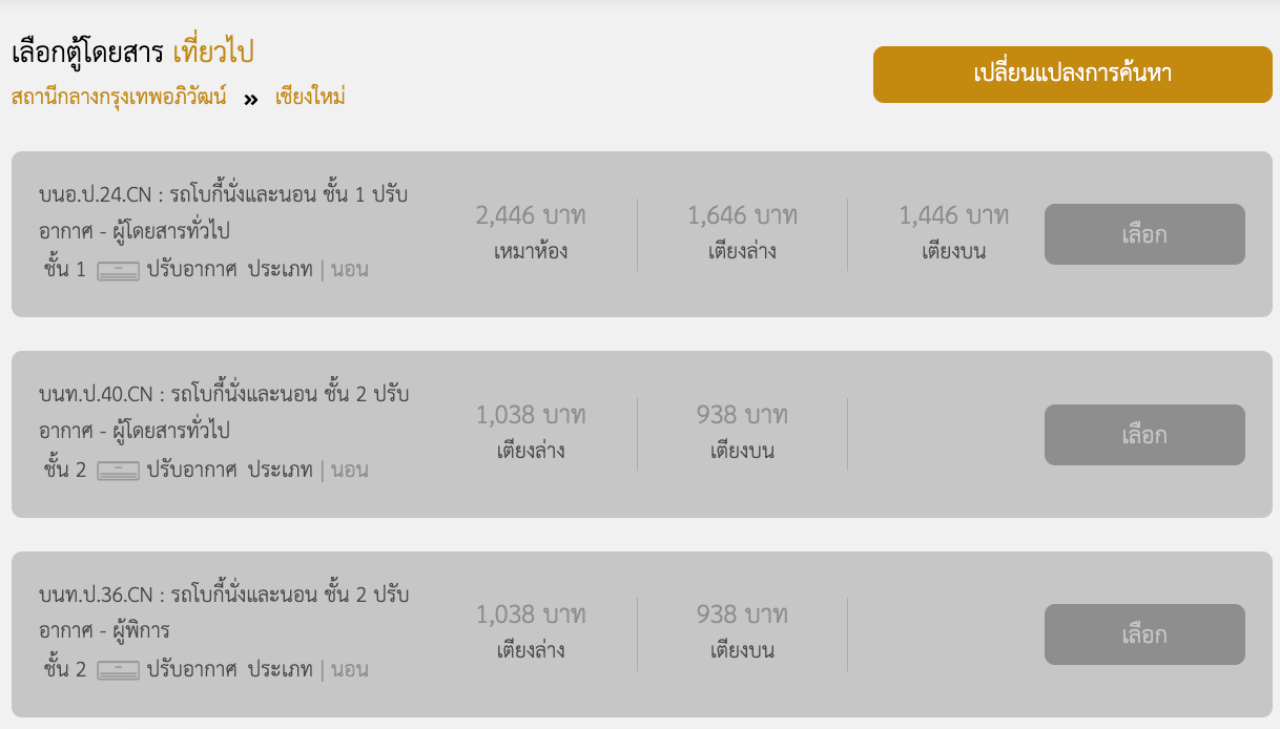 10. เมื่อเลือกได้แล้ว ระบบจะนำไปยังหน้า “เลือกตู้โดยสาร” ซึ่งจะมีทั้งแบบพัดลม ตู้ปรับอากาศ ตู้นอน