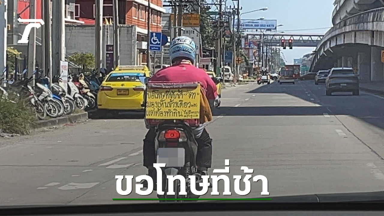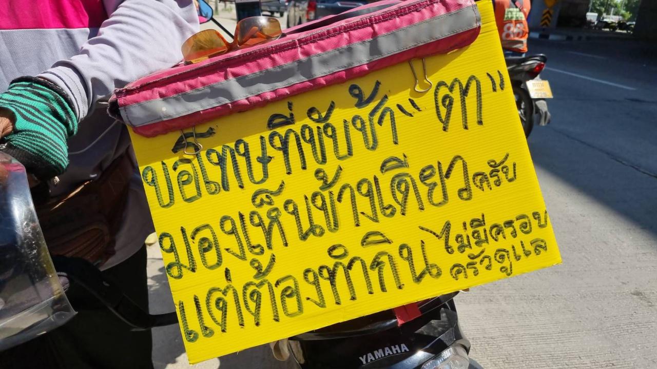 ไรเดอร์เปิดที่มา ติดป้ายท้ายรถขอโทษที่ขับช้า เพราะผมมองเห็นข้างเดียว หลังก่อนหน้าเคยโดนสาวโมโหหิว ขับเก๋งบีบแตรไล่