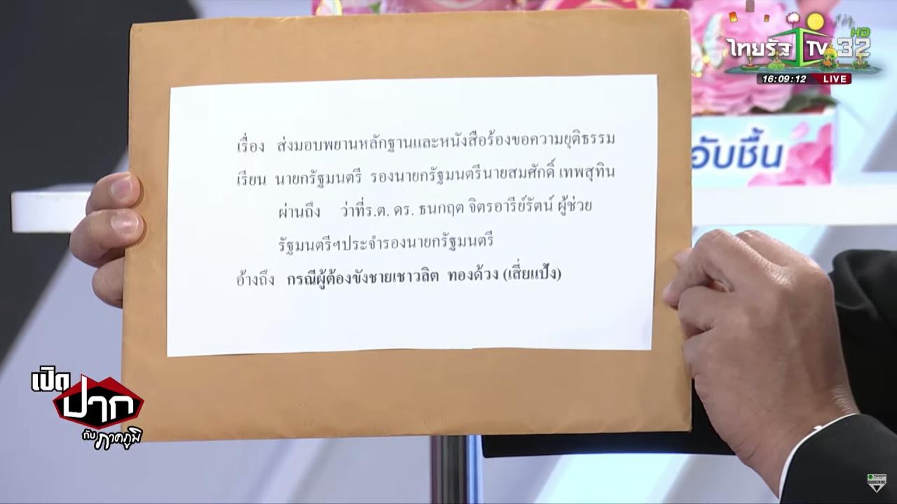 ทั้งนี้ระหว่างดำเนินรายการ ร.ต.ชัชวาลย์ ได้ออกไปรับหนังสือร้องเรียนของ "เสี่ยแป้ง" โดยหน้าซองเอกสาร ระบุว่า "เรื่อง ส่งมอบพยานหลักฐานและหนังสือร้องขอความยุติธรรม เรียน นายกรัฐมนตรี รองนายกรัฐมนตรี นายสมศักดิ์ เทพสุทิน ผ่านถึง ร.ต. ดร.ธนกฤต จิตรอารีย์รัตน์ ผู้ช่วยรัฐมนตรีฯ ประจำรองนายกรัฐมนตรี อ้างถึง กรณีผู้ต้องขังชายเชาวลิต ทองด้วง (เสี่ยแป้ง)"