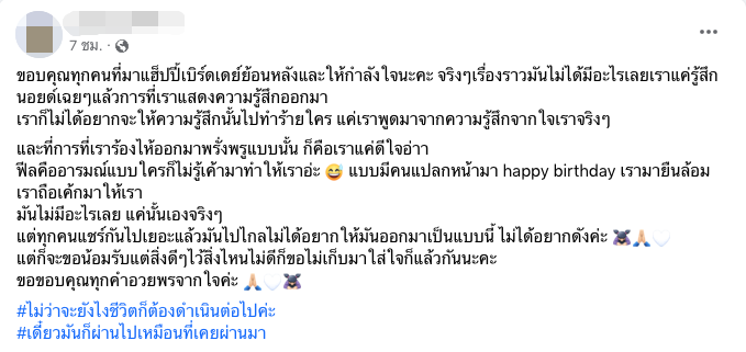 ทั้งนี้ เธอยังได้โพสต์ข้อความในเฟซบุ๊กส่วนตัว โดยระบุว่า ขอบคุณทุกคนที่มาแฮปปี้เบิร์ธเดย์ย้อนหลัง และให้กำลังใจนะคะ จริงๆ เรื่องราวมันไม่ได้มีอะไรเลย เราแค่รู้สึกนอยด์เฉยๆ แล้วการที่เราแสดงความรู้สึกออกมา เราก็ไม่ได้อยากจะให้ความรู้สึกนั้นไปทำร้ายใคร แค่เราพูดมาจากความรู้สึกจากใจเราจริงๆ และที่การที่เราร้องไห้ออกมาพรั่งพรูแบบนั้น ก็คือเราแค่ดีใจอ่า ฟีลคืออารมณ์แบบใครก็ไม่รู้เค้ามาทำให้เราอะ