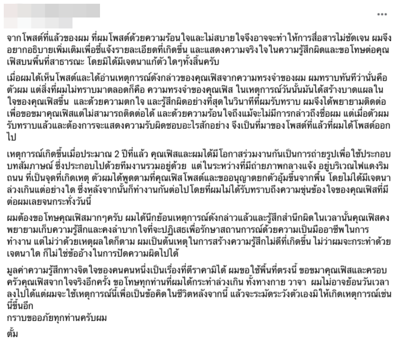 เมื่อผมได้เห็นโพสต์และได้อ่านเหตุการณ์ดังกล่าวของคุณเฟิสจากความทรงจำของผม ผมทราบทันทีว่านั่นคือตัวผม แต่สิ่งที่ผมไม่ทราบมาตลอดก็คือ ความทรงจำของคุณเฟิสในเหตุการณ์วันนั้น มันได้สร้างบาดแผลในใจของคุณเฟิสขึ้น ด้วยความตกใจและรู้สึกผิดอย่างที่สุดในวินาทีที่ผมรับทราบ ผมจึงได้พยายามติดต่อเพื่อขอขมาคุณเฟิสแต่ไม่สามารถติดต่อได้ และด้วยความร้อนใจถึงแม้จะไม่มีการกล่าวถึงชื่อผม แต่เมื่อตัวผมรับทราบแล้วและต้องการจะแสดงความรับผิดชอบอะไรสักอย่าง จึงเป็นที่มาของโพสต์ที่แล้วที่ผมได้โพสต์ออกไป