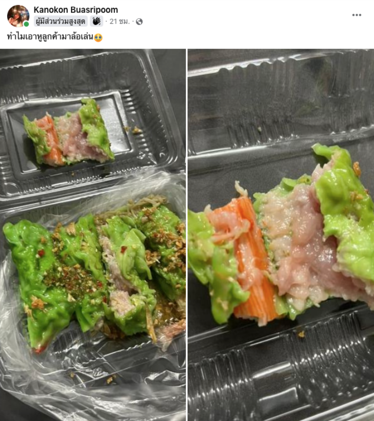 กลายเป็นโพสต์ที่ถูกพูดถึงอย่างมากในโลกออนไลน์ เมื่อผู้ใช้เฟซบุ๊กรายหนึ่ง ได้โพสต์ภาพ "หมูดิบอยู่ในเกี๊ยว" พร้อมข้อความผ่านกลุ่ม พวกเราคือผู้บริโภค โดยระบุว่า "ทำไมเอาหูลูกค้ามาล้อเล่น"