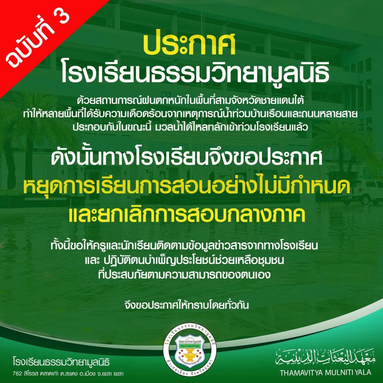 ทั้งนี้ ทางแฟนเพจ Thamavitya Mulniti School - โรงเรียนธรรมวิทยามูลนิธิ ยะลา ซึ่งตั้งอยู่บนถนนสิโรรส อ.เมือง จ.ยะลา ได้เผยแพร่ประกาศของโรงเรียนฉบับที่ 3 โดยมีข้อความว่า "ประกาศโรงเรียนธรรมวิทยามูลนิธิ ด้วยสถานการณ์ฝนตกหนักในพื้นที่สามจังหวัดชายแดนใต้ ทำให้หลายพื้นที่ได้รับความเดือดร้อนจากเหตุการณ์น้ำท่วมบ้านเรือนและถนนหลายสาย ประกอบกับในขณะนี้ มวลน้ำได้ไหลทลักเข้าท่วมโรงเรียนแล้ว
