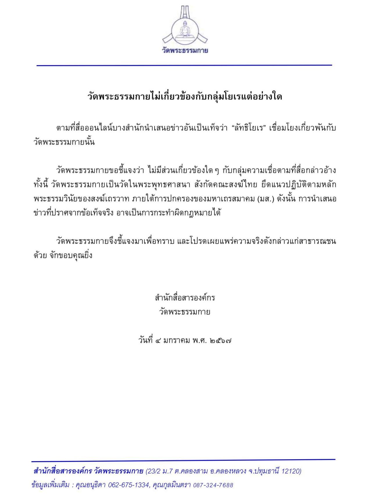 วันที่ 4 มกราคม 67 ผู้สื่อข่าวรายงานว่า ทางวัดพระธรรมกาย ได้ออกหนังสือชี้แจงกรณีตกเป็นข่าวเกี่ยวข้องกับกลุ่มโยเร