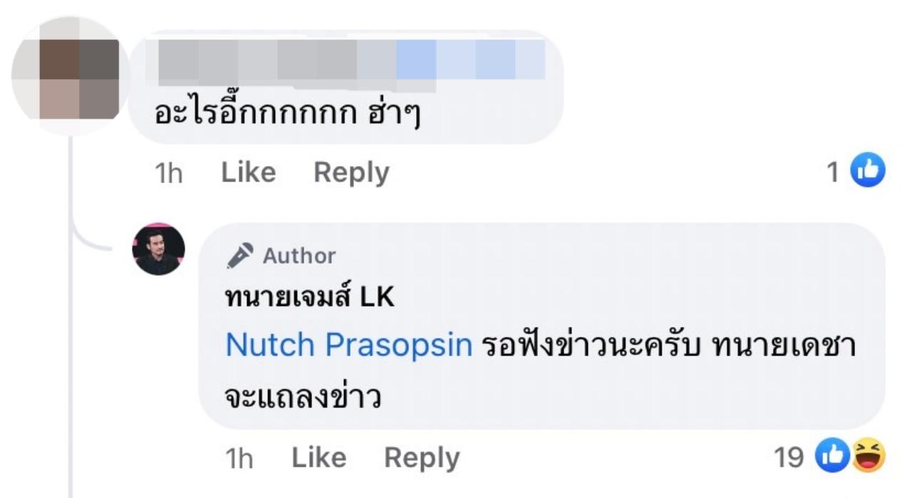 ทั้งนี้ ทนายเจมส์ยังบอกในคอมเมนต์อีกว่า "รอฟังข่าวนะครับ ทนายเดชาจะแถลงข่าว"