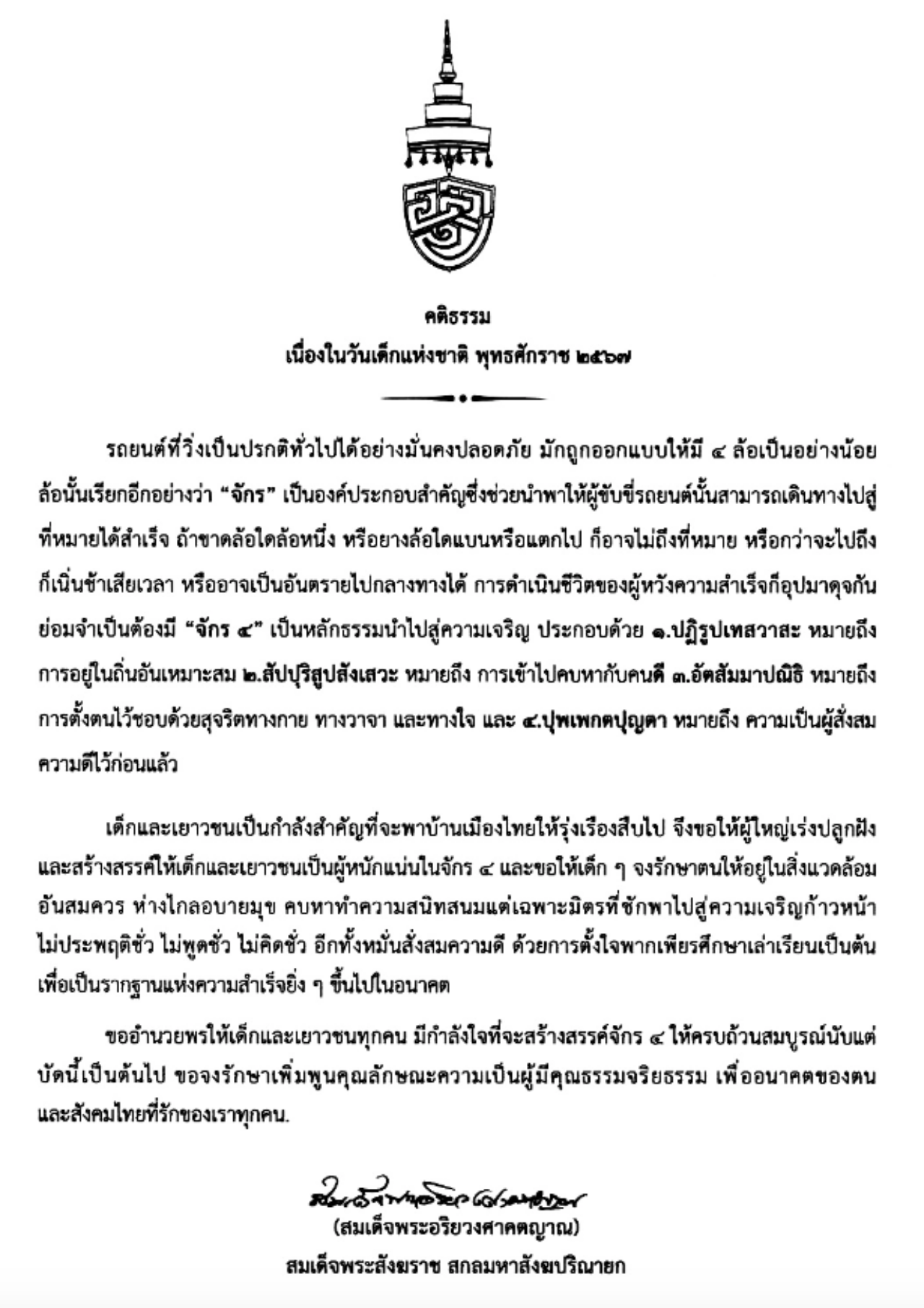 สมเด็จพระสังฆราช สกลมหาสังฆปริณายก ประทานพระคติธรรม "วันเด็กแห่งชาติ" ปี 2567 ขอให้ผู้ใหญ่เร่งปลูกฝังและสร้างสรรค์ให้เด็กและเยาวชนเป็นผู้หนักแน่นในจักร 4