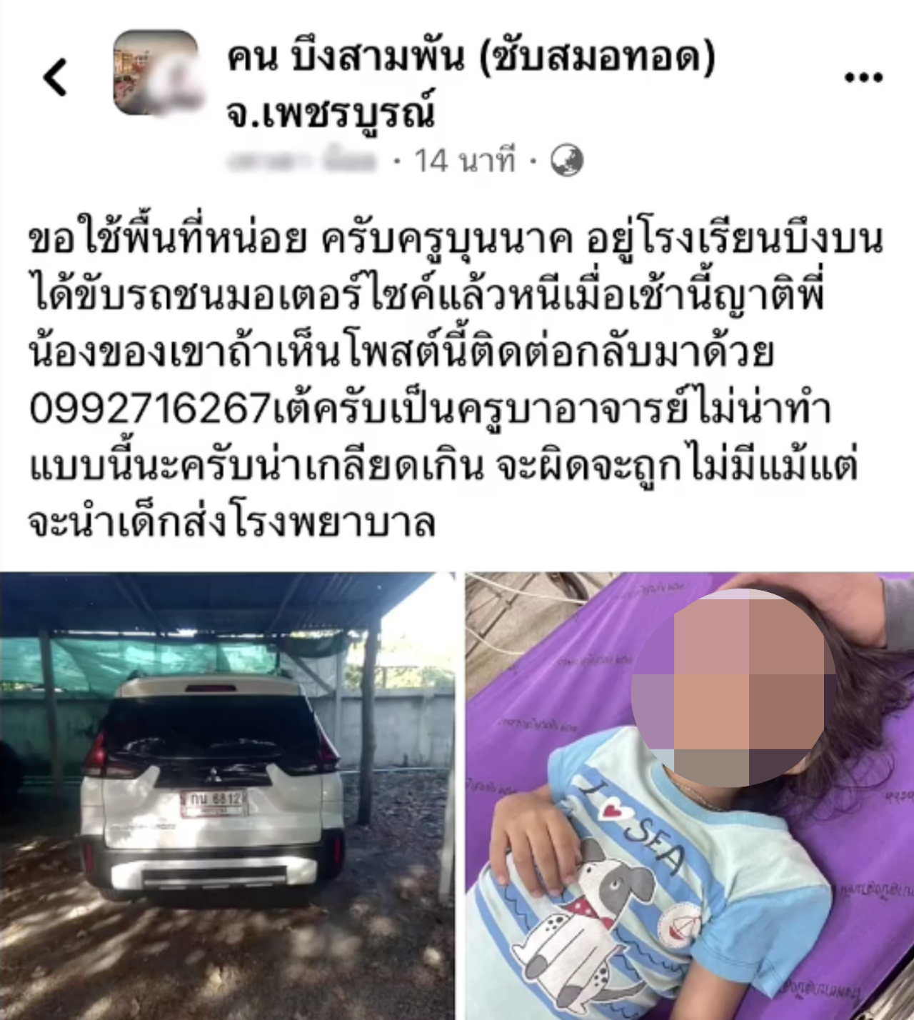 วันที่ 17 มกราคม 2567 จากกรณีที่ผู้ใช้เฟซบุ๊กรายหนึ่ง ได้โพสต์ภาพรถเก๋งสีขาว ทะเบียน กน 6812 เพชรบูรณ์ และภาพเด็กน้อยที่กำลังร้องไห้ มีบาดแผลตามร่างกายจำนวนหลายที่ ลงในกลุ่ม คน บึงสามพัน (ซับสมอทอด) จ.เพชรบูรณ์ เพื่อตามหาคุณครูท่านหนึ่งในโรงเรียนบึงบน ที่ขับรถชนมอเตอร์ไซค์แล้วหนี