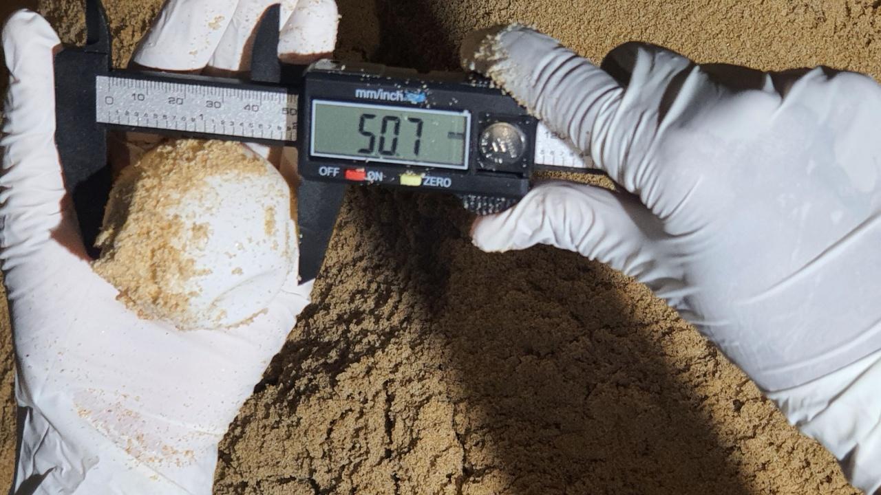 จากการวัดรอย พบความกว้างพายทั้งหมด 202 ซม. ความกว้างอก 130 ซม. ซึ่งตรงกับขนาดของ Big Mom วัดความลึกปากหลุมถึงไข่ 72 ซม. พบไข่สมบูรณ์ 92 ฟอง ไข่ลม 43 ฟอง รวม 135 ฟอง ไข่เต่ามีขนาด 5.07 ซม. เจ้าหน้าที่ได้ทำการขุดย้ายไข่เต่า เนื่องจากมีความเสี่ยงต่อการสูญหาย และน้ำทะเลจะท่วมถึง