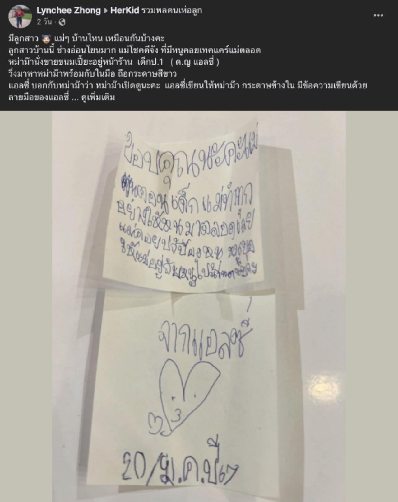 วันที่ 25 ม.ค.67 โลกโซเชียล มีการแชร์โพสต์ของผู้ใช้เฟซบุ๊ก "Lynchee Zhong" จากกลุ่ม "HerKid รวมพลคนเห่อลูก" เกี่ยวกับความน่ารักของลูกสาว หลังจากที่น้องเขียนกระดาษโน้ต ขอบคุณแม่ที่ทำทุกอย่างให้ และยังคอยปกป้องน้อง โดยมีแคปชั่นว่า "มีลูกสาว แม่ๆ บ้านไหน เหมือนกันบ้างคะ ลูกสาวบ้านนี้ ช่างอ่อนโยนมาก แม่โชคดีจัง ที่มีหนูคอยเทคแคร์แม่ตลอด