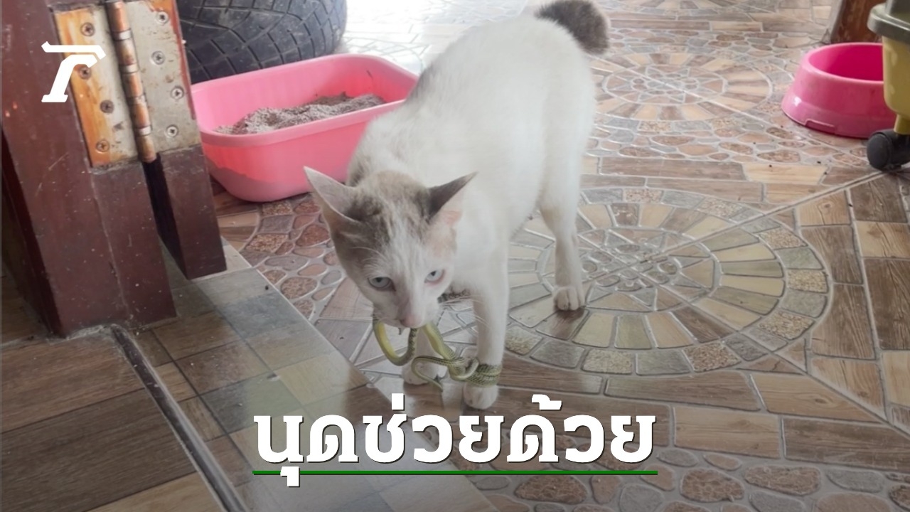 ทาสถึงกับปวดหัว เมื่อแม่แมวคาบงูเขียวเข้าบ้าน หวังจะเอามาฝากลูก แต่งานนี้เดินไม่ถนัด เพราะเจอรัดขากลับจนแน่น เกือบสะดุด
