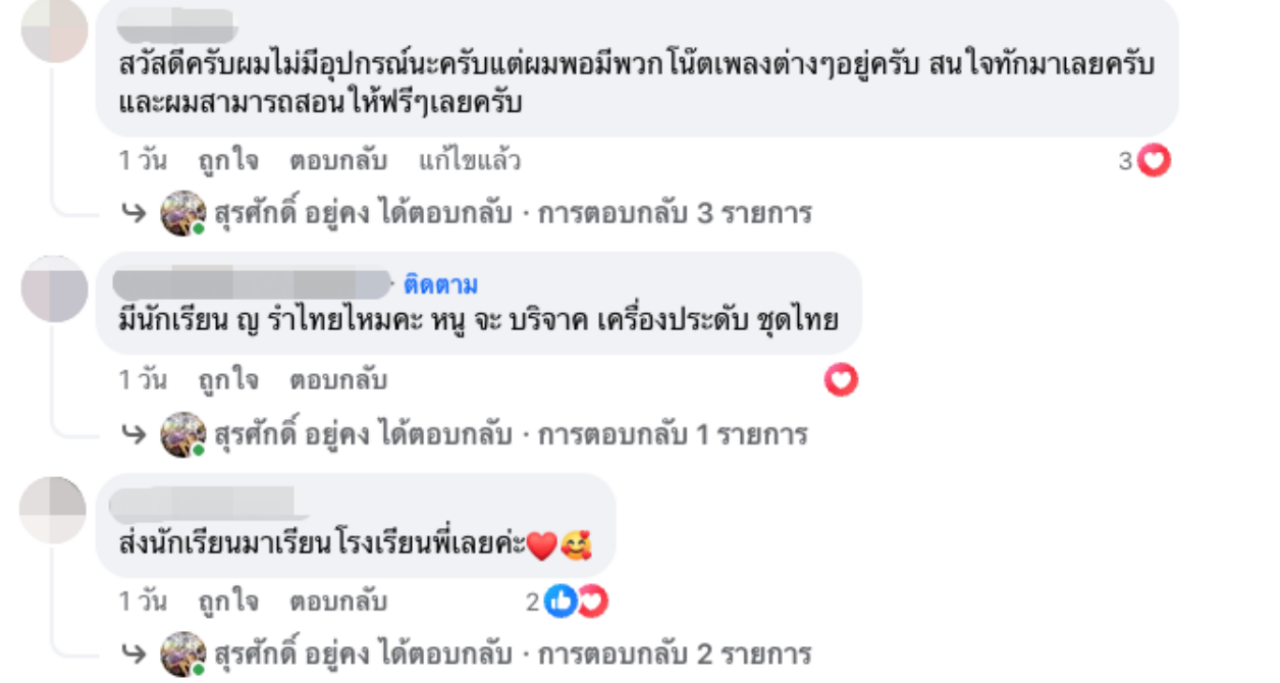 ต่อมา คุณสุรศักดิ์ อยู่คง ผู้ใช้เฟซบุ๊กรายดังกล่าวได้เปิดใจกับ "ทีมข่าวไทยรัฐออนไลน์" โดยระบุว่า กลุ่มเด็กนักเรียนดังกล่าว มีทั้งเด็กผู้ชายและเด็กผู้หญิง ตั้งแต่ชั้น ป.1-ป.6 ใจจริงสิ่งที่โพสต์ หวังแค่กลุ่มนักดนตรีไทยเล็กๆ ที่จะช่วยกัน ไม่คิดว่าคนจะให้ความสนใจมากขนาดนี้