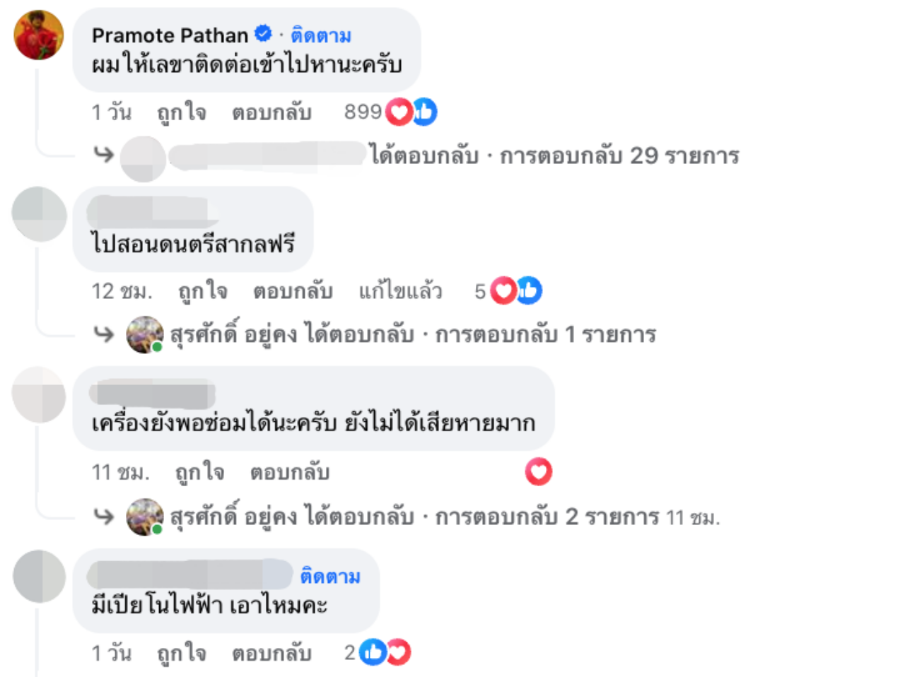 หลังจากเรื่องราวดังกล่าวถูกเผยแพร่ออกไป ต่างก็คนเข้ามาแสดงความคิดเห็น และร่วมบริจาคเครื่องดนตรีให้เป็นจำนวนมาก หนึ่งในนั้นคือ โอ๊ต-ปราโมทย์ ศิลปินชื่อดังที่ได้บอกว่า จะให้เลขาติดต่อไป