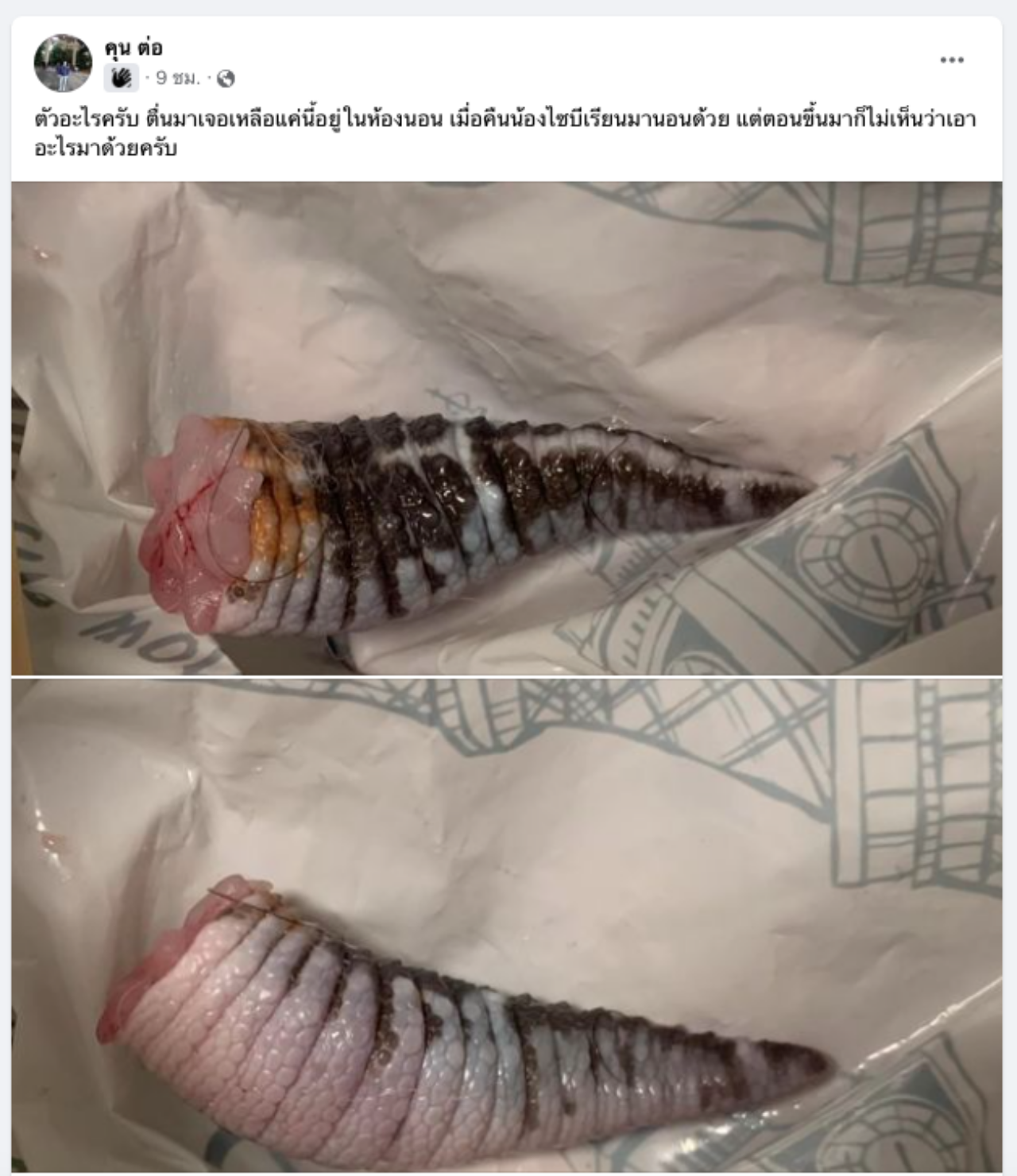 หนุ่มสุดงง โพสต์ถามโซเชียลหลังตื่นมาเจอ "หางปริศนา" สุดท้ายหาทั่วบ้าน พบเป็นชิ้นส่วนสัตว์เลี้ยงของลูกสาวที่แอบซื้อมาเลี้ยง