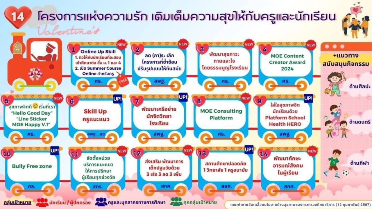 การดำเนินการที่ผ่านมา ศธ. ได้ดำเนินโครงการและกิจกรรมเพื่อพัฒนาทักษะชีวิตรอบด้าน สร้างภูมิคุ้มกันทางใจให้กับนักเรียน นักศึกษา และพัฒนาคุณภาพของครูและบุคลากร ให้สามารถส่งเสริม สนับสนุน และให้ความช่วยเหลือผู้เรียนให้มีการเรียนรู้ที่สมวัยด้วยการเรียนรู้อย่างมีความสุข และมีทักษะชีวิตผ่าน 14 โครงการแห่งความรัก บวก 1 แนวทางเติมเต็มความสุขให้กับครู และนักเรียน ดังนี้