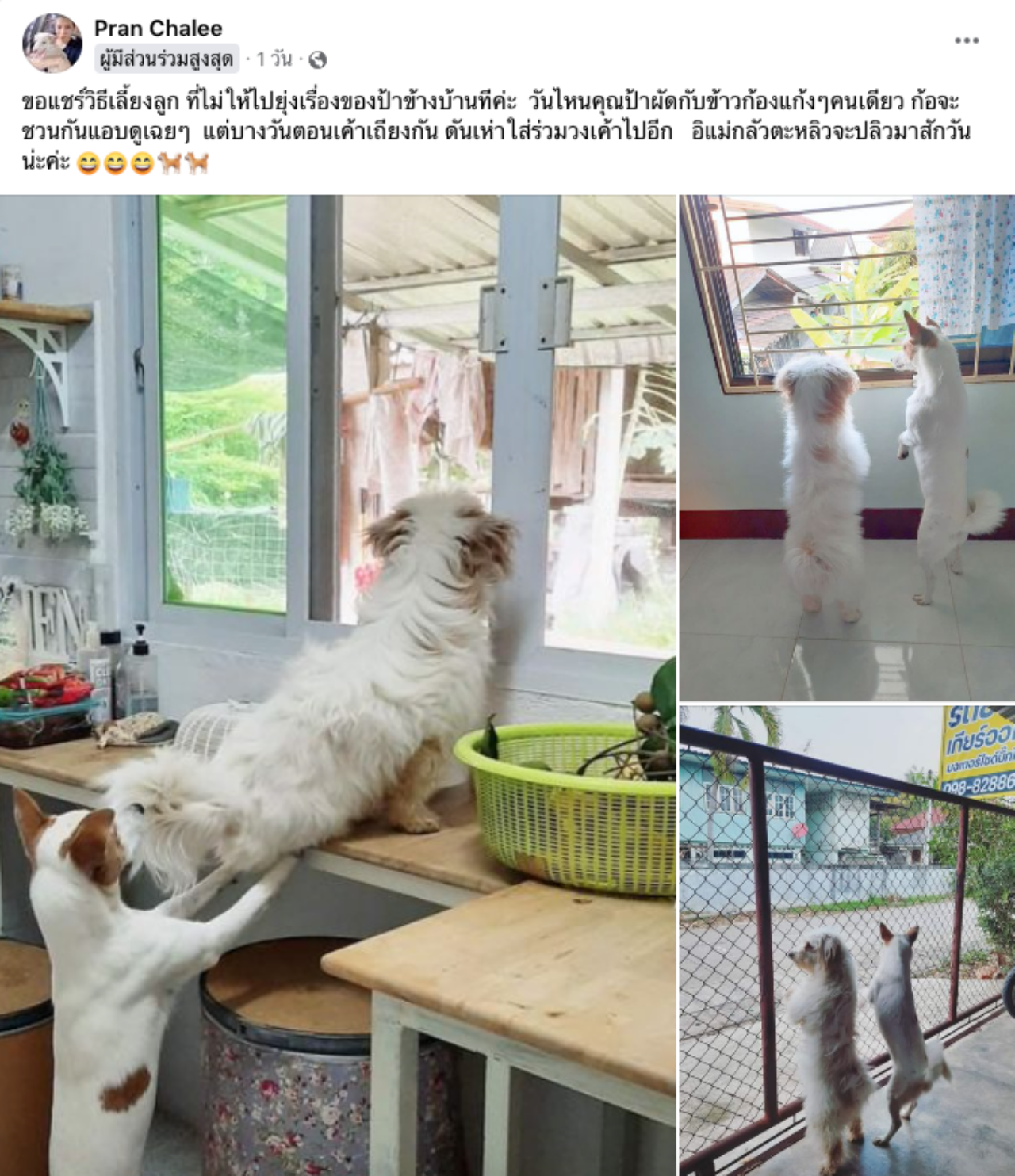 เรียกได้ว่า เป็นไวรัลชวนยิ้มที่ถูกแชร์ในโลกออนไลน์ เมื่อผู้ใช้เฟซบุ๊ก Pran Chalee ได้โพสต์ภาพพร้อมข้อความลงในกลุ่ม งานบ้านที่รัก ระบุว่า ขอแชร์วิธีเลี้ยงลูก ที่ไม่ให้ไปยุ่งเรื่องของป้าข้างบ้านทีค่ะ วันไหนคุณป้าผัดกับข้าวก๊องแก๊งๆ คนเดียว ก็จะชวนกันแอบดูเฉยๆ แต่บางวันตอนเขาเถียงกัน ดันเห่าใส่ร่วมวงเขาไปอีก อิแม่กลัวตะหลิวจะปลิวมาสักวันน่ะค่ะ