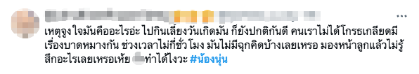 ซึ่งหลังจากที่มีข่าวออกไป เพื่อนๆ ของน้องนุ่น ผู้สูญหาย ได้โพสต์สเตตัสเดือด โมโหที่เพื่อนถูกทำร้าย รวมทั้งยังแท็กเฟซบุ๊กผู้เป็นสามีน้องนุ่น และด่าทอที่ลงมือฆ่าอย่างโหดเหี้ยม ขณะที่คนในโลกออนไลน์ ก็แสดงความคิดเห็นเกี่ยวกับเรื่องดังกล่าวเป็นจำนวนมาก มีทั้งร่วมไว้อาลัยน้องนุ่นจากเหตุการณ์ที่เกิดขึ้น แสดงความเสียใจกับทางครอบครัว และกล่าวเห็นใจที่ต้องมาเผชิญกับสถานการณ์แบบนี้ รวมถึงกล่าวตำหนิ และแฉพฤติกรรมของผู้เป็นสามีในช่วงสมัยเรียน เผยแชตที่เคยได้พูดกันในช่วงก่อนเหตุ และหลังเกิดเหตุ พร้อมกับติด #น้องนุ่น จนขึ้นเทรนด์ต่อเนื่องในทวิตเตอร์ (x)