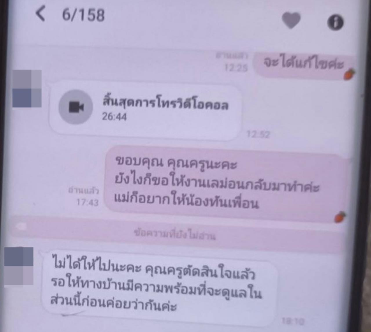 จากนั้นแม่เด็กได้เขียนตอบกลับไปว่า "ขอบคุณ คุณครูนะคะ ยังไงก็ขอให้งานเลม่อนกลับมาทำคะ แม่ก็อยากให้น้องทันเพื่อน" แต่ได้รับคำตอบจากครูว่า "ไม่ได้ให้ไปนะคะ คุณครูตัดสินใจแล้วรอให้ทางบ้านมีความพร้อมที่จะดูแลในส่วนนี้ก่อนค่อยว่ากันค่ะ"