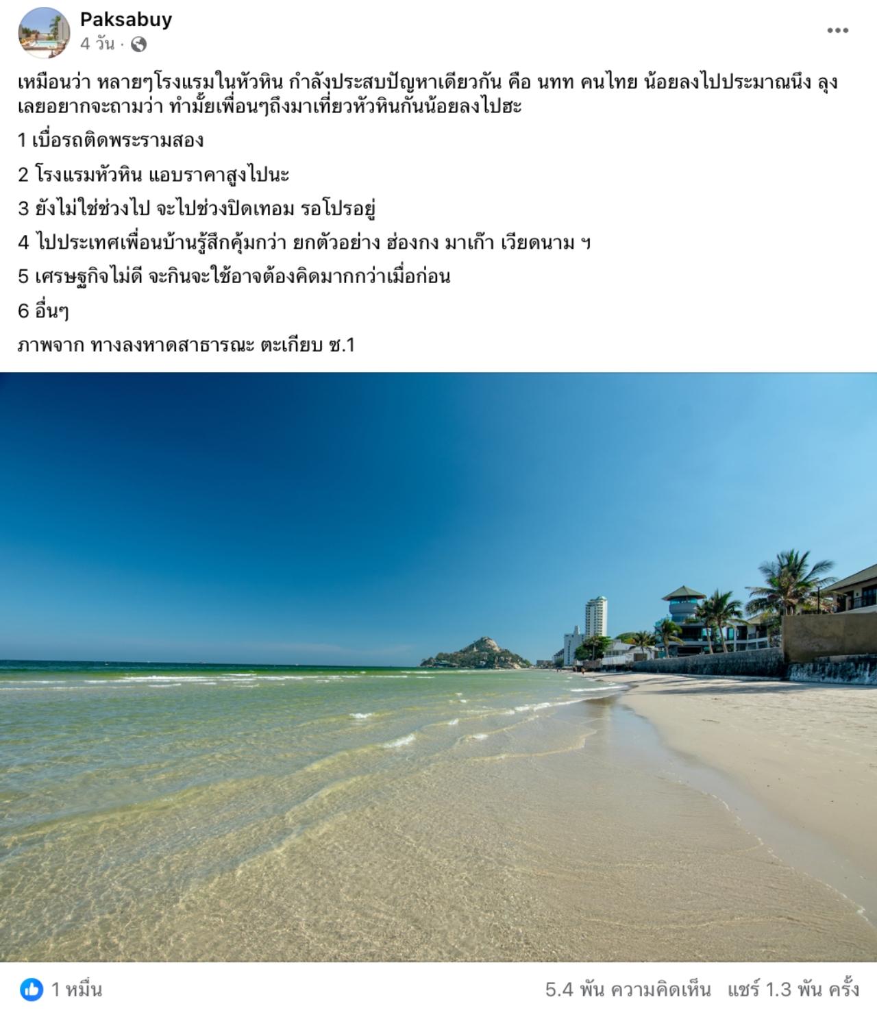 วันที่ 25 ก.พ. 2567 มีรายงานว่า โลกออนไลน์ได้ให้ความสนใจสถานการณ์การท่องเที่ยวในหัวหิน ซึ่งเป็นแหล่งท่องเที่ยวชื่อดังของไทย หลังจากแฟนเพจ Paksabuy ที่ได้โพสต์ภาพและข้อความว่า "เหมือนว่า หลายๆ โรงแรมในหัวหิน กำลังประสบปัญหาเดียวกัน คือ นักท่องเที่ยวคนไทยน้อยลงไปประมาณนึง ลุงเลยอยากจะถามว่า ทำไมเพื่อนๆ ถึงมาเที่ยวหัวหินกันน้อยลงไปฮะ