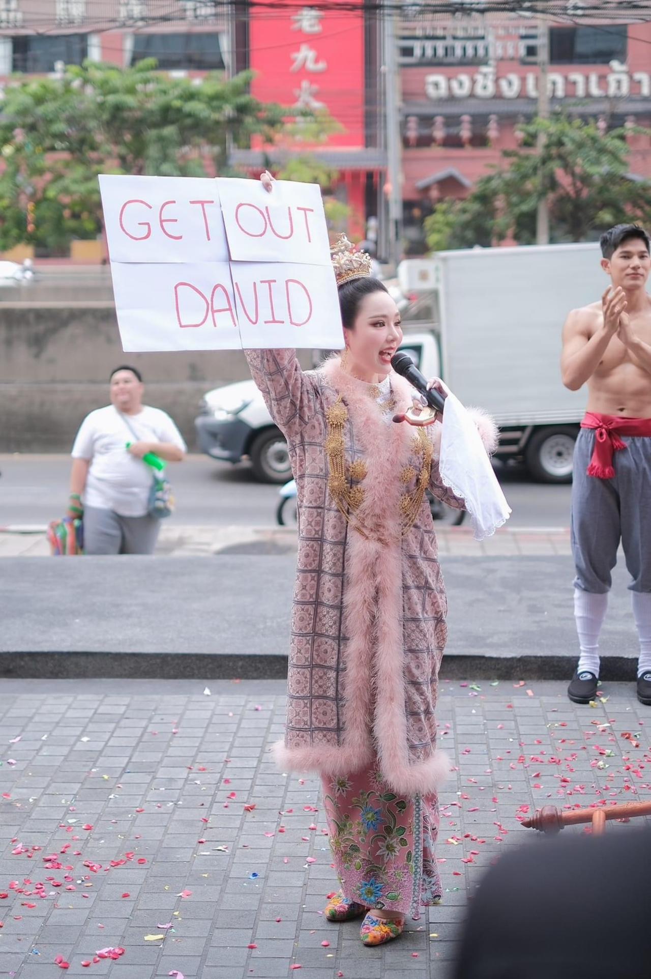 จากนั้นหลินได้เดินลงจากรถลากแล้วเดินไปหยิบป้ายจากทีมงานที่มีการเขียนว่า "GET OUT DAVID" พร้อมกับกล่าวว่า "เราเป็นคนไทยอยู่ในผืนแผ่นดินไทย ไม่ว่าจะชาติอะไรที่เข้ามาอยู่ในผืนแผ่นดินไทย ทำมาหากินในประเทศของเรา ควรที่จะรักประเทศไทยและรักคนไทยด้วยนะคะ" จากนั้นได้เดินเข้าไปรายงานตัวกับกองประกวดมิสแกรนด์ไทยแลนด์ 2024 ภายในโรงแรม Swissotel Ratchada กรุงเทพฯ.