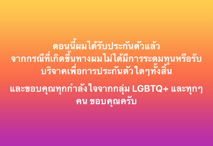 อย่างไรก็ตาม ล่าสุด "น้องแชมป์" ได้โพสต์ข้อความผ่านทางเฟซบุ๊กส่วนตัว และใน IG สตอรี่ โดยระบุว่า ตอนนี้ผมได้รับประกันตัวแล้ว จากกรณีที่เกิดขึ้นทางผมไม่ได้มีการระดมทุน หรือรับบริจาคเพื่อการประกันตัวใดๆ ทั้งสิ้น และขอบคุณทุกกำลังใจจากกลุ่ม LGBTQ+ และทุกๆคน ขอบคุณครับ.