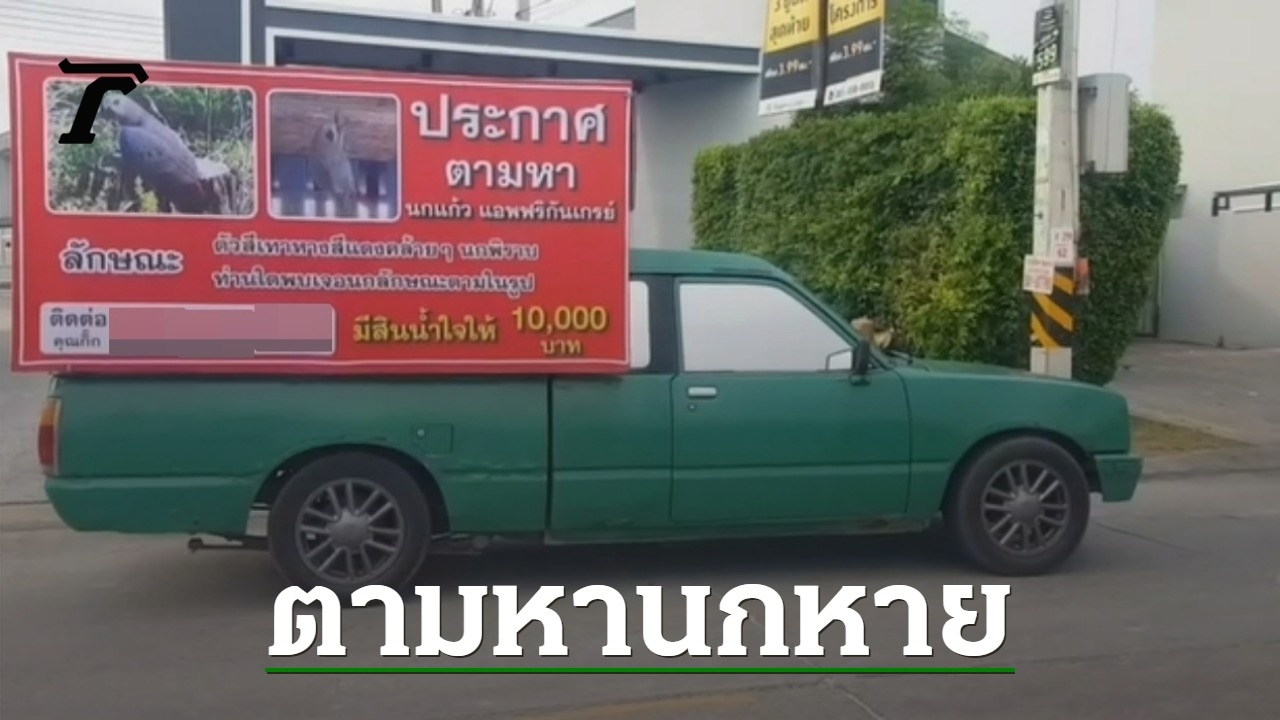 เจ้าของคิดถึงมาก จ้างรถแห่โฆษณาติดป้ายประกาศตามหา "นกแก้ว" แอฟริกันเกรย์ ตัวสีเทาหางแดง ใครพบเจอ หรือนำมาส่งคืน มีรางวัลให้ 1 หมื่นบาท