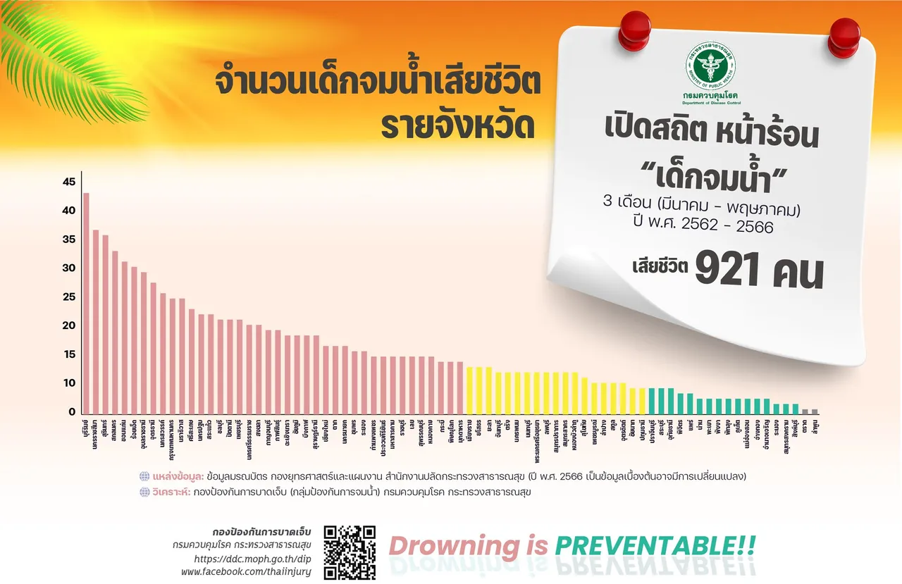 อย่างไรก็ตาม สำหรับข้อมูลจาก กรมควบคุมโรค ที่เผยสถิติ "เด็กจมน้ำ" หน้าร้อนในช่วง 3 เดือน (มีนาคม-พฤษภาคม) ระหว่างปี พ.ศ.2562-2566 พบว่า มีเด็กเสียชีวิต 921 คน โดย 5 อันดับจังหวัดที่เด็กจมน้ำสูงสุด คือ บุรีรัมย์ นครราชสีมา สุรินทร์ สกลนคร และขอนแก่น.