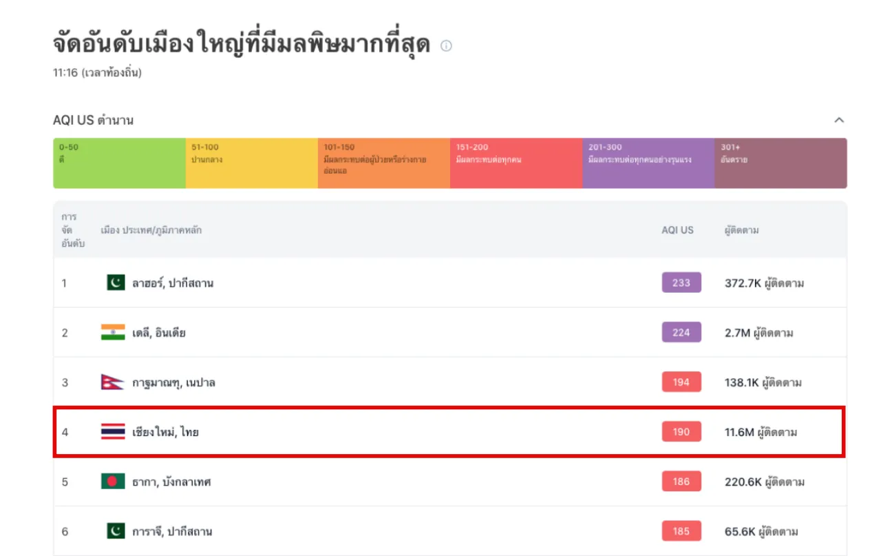 เชียงใหม่ยังอ่วม ค่าฝุ่น PM 2.5 พุ่งต่อเนื่อง ติดอันดับ 4 เมืองใหญ่ที่มีมลพิษมากที่สุด ซึ่งมีผลกระทบต่อสุขภาพของทุกคน