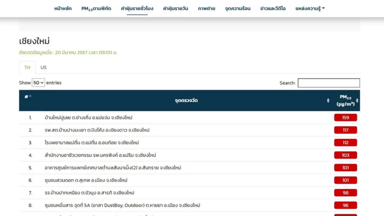 ส่วน 5 อันดับที่มีค่าฝุ่นละอองขนาดเล็ก PM 2.5 มากที่สุด คือ 1. บ้านใหม่ปูเลย ต.ช่างเคิ่ง อ.แม่แจ่ม จ.เชียงใหม่ มีค่า 159 ไมโครกรัมต่อลูกบาศก์เมตร 2. รพ.สต.บ้านปางมะเยา ต.ปิงโค้ง อ.เชียงดาว จ.เชียงใหม่ มีค่า 117 ไมโครกรัมต่อลูกบาศก์เมตร 3. โรงพยาบาลแม่ตื่น ต.แม่ตื่น อ.อมก๋อย จ.เชียงใหม่ มีค่า 112 ไมโครกรัมต่อลูกบาศก์เมตร 4. สำนักงานอาชีวเวชกรรม รพ.นครพิงค์ อ.แม่ริม จ.เชียงใหม่ มีค่า 103 ไมโครกรัมต่อลูกบาศก์เมตร และ 5. อาคารศูนย์การแพทย์เทศบาลตำบลสันนาเม็ง (2) อ.สันทราย จ.เชียงใหม่ มีค่า 101 ไมโครกรัมต่อลูกบาศก์เมตร