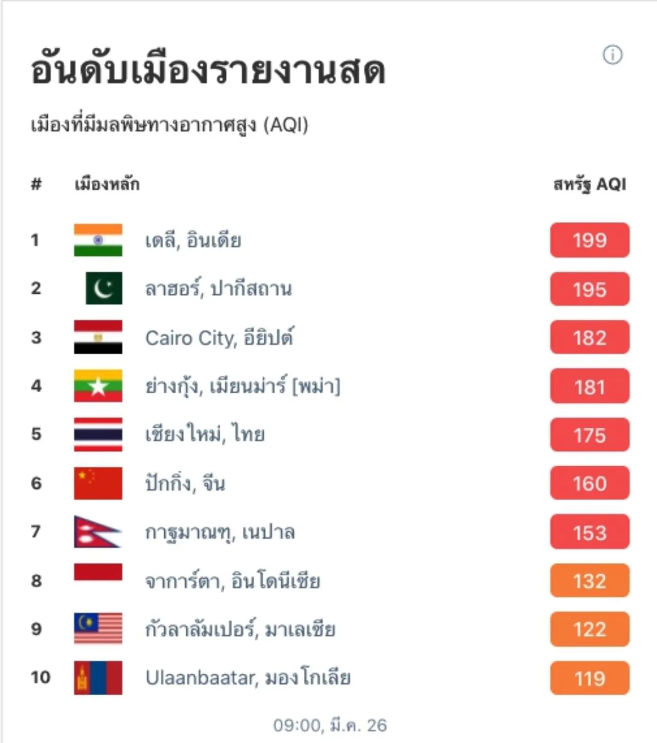 อย่างไรก็ตาม เว็บไซต์ IQAir ที่คอยสังเกตการณ์คุณภาพอากาศของเมืองสำคัญทั่วโลก ได้อัปเดตการจัดอันดับเมืองใหญ่ที่มีมลพิษมากที่สุดแบบเรียลไทม์ ณ เวลา 09.20 น. พบว่าจังหวัดเชียงใหม่ ขึ้นมาอยู่อันดับที่ 5 ของโลก โดยวัดได้ 175 AQI US อยู่ในระดับสีแดง มีผลกระทบต่อทุกคน.