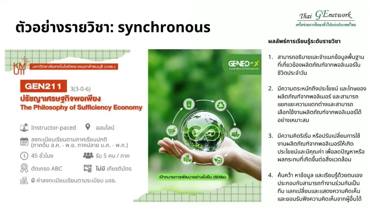 - รายวิชา GEN211 ปรัชญาเศรษฐกิจพอเพียง ที่พระจอมเกล้าธนบุรี ระบุไว้ชัดเจนว่าเป็นการเรียนเป็นแบบออนไลน์เท่านั้น เรียนกี่ชั่วโมง มีผลลัพธ์การเรียนรู้ที่ระบุชัดเจน