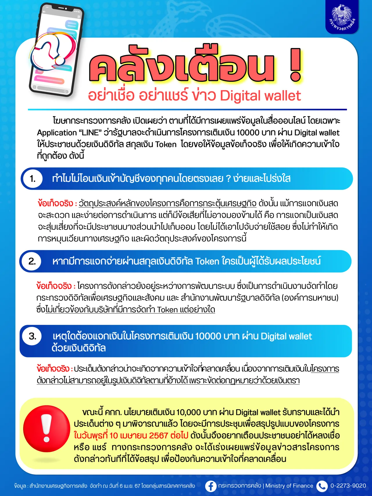 "กระทรวงการคลัง" ย้ำ 3 ข้อเท็จจริงปมเงิน Digital wallet เตือนประชาชนอย่าหลงเชื่อข่าวเท็จ พร้อมเร่งเผยแพร่ข้อมูลโครงการทันทีที่ได้ข้อสรุป