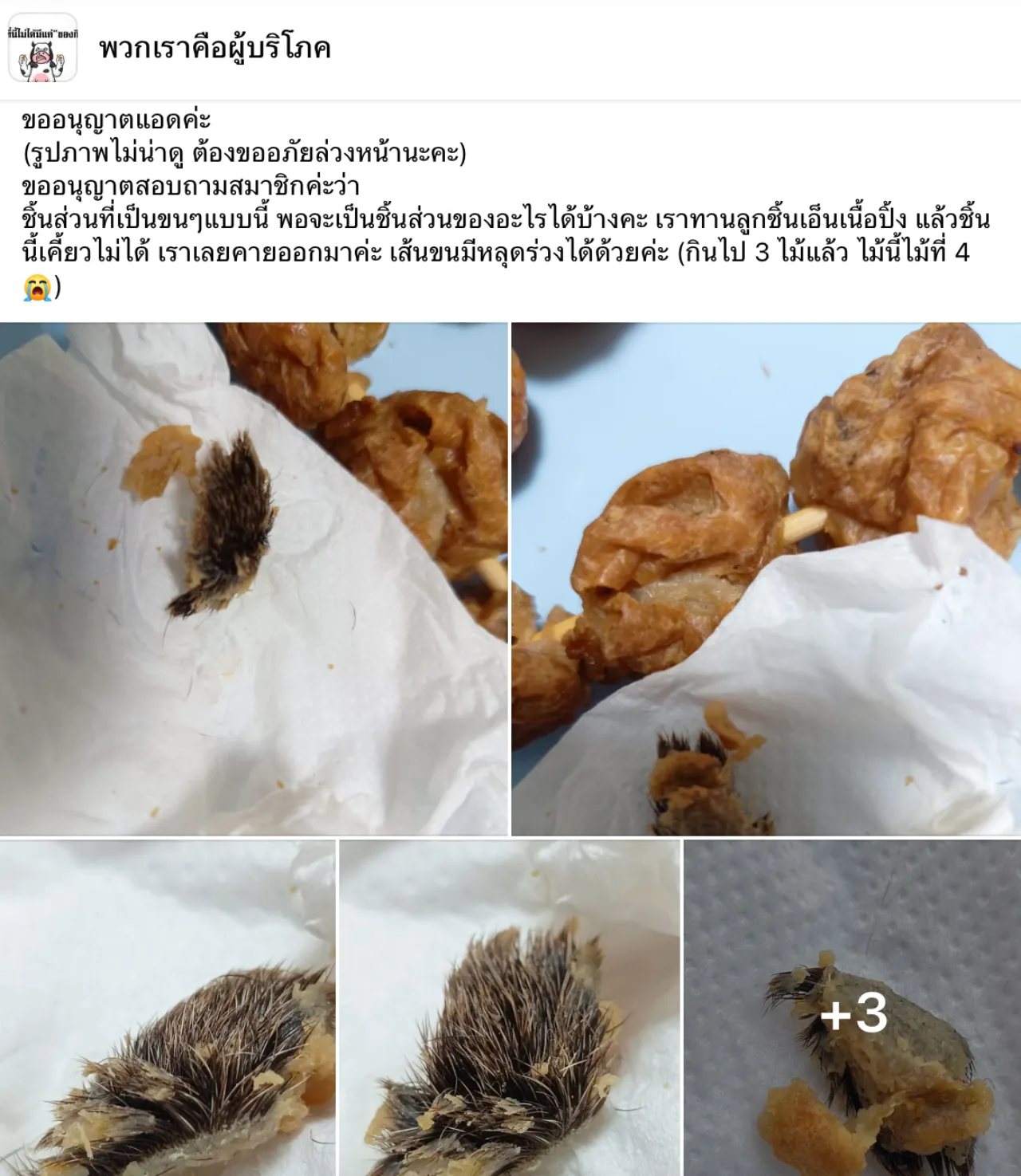 กลายเป็นโพสต์ที่ถูกพูดถึงอย่างมากในโลกออนไลน์ เมื่อผู้ใช้เฟซบุ๊กรายหนึ่ง ได้โพสต์ภาพหลังเจอ "ขนประหลาดในอาหาร" ผ่านกลุ่ม พวกเราคือผู้บริโภค พร้อมระบุข้อความว่า "รูปภาพไม่น่าดู ต้องขออภัยล่วงหน้านะคะ ขออนุญาตสอบถามสมาชิก ว่าชิ้นส่วนที่เป็นขนๆ แบบนี้ พอจะเป็นชิ้นส่วนของอะไรได้บ้าง เราทานลูกชิ้นเอ็นเนื้อปิ้ง แล้วชิ้นนี้เคี้ยวไม่ได้เลยคายออกมา เส้นขนมีหลุดร่วงได้ด้วยค่ะ กินไป 3 ไม้แล้ว ไม้นี้ไม้ที่ 4"