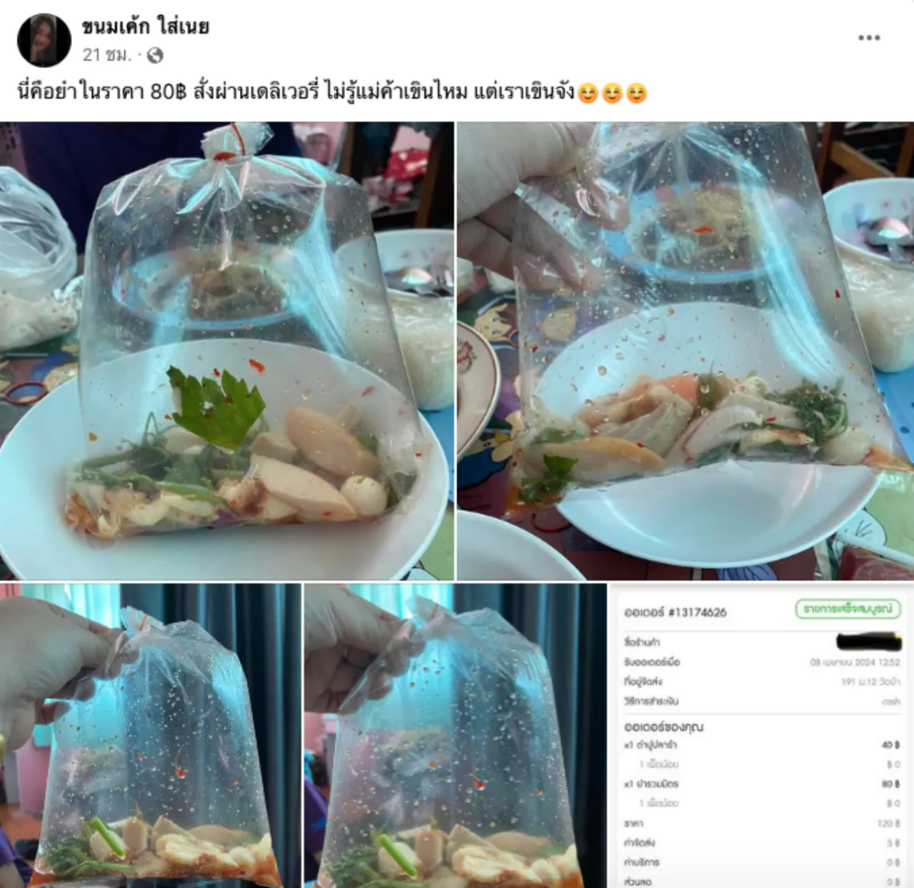 วันที่ 10 เมษายน 2567 ผู้สื่อข่าวรายงานว่า กลายเป็นประเด็นที่ถูกพูดถึงในโลกออนโลน์ เมื่อผู้ใช้เฟซบุ๊ก ขนมเค้ก ใส่เนย ได้โพสต์ภาพยำรวมมิตรที่สั่งมาทาน พร้อมระบุข้อความว่า "นี่คือยำในราคา 80 สั่งผ่านเดลิเวอรี่ ไม่รู้แม่ค้าเขินไหม แต่เราเขินจัง"
