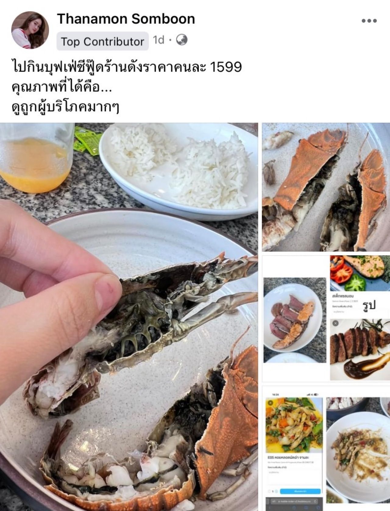 วันที่ 14 เมษายน 2567 ผู้สื่อข่าวรายงานว่า จากกรณีที่ผู้ใช้เฟซบุ๊ก Thanamon Somboon ได้โพสต์ภาพและข้อความลงในกลุ่ม พวกเราคือผู้บริโภค ระบุว่า ไปกินบุฟเฟต์ซีฟู้ดร้านดัง ราคาคนละ 1,599 คุณภาพที่ได้คือ… ดูถูกผู้บริโภคมากๆ
