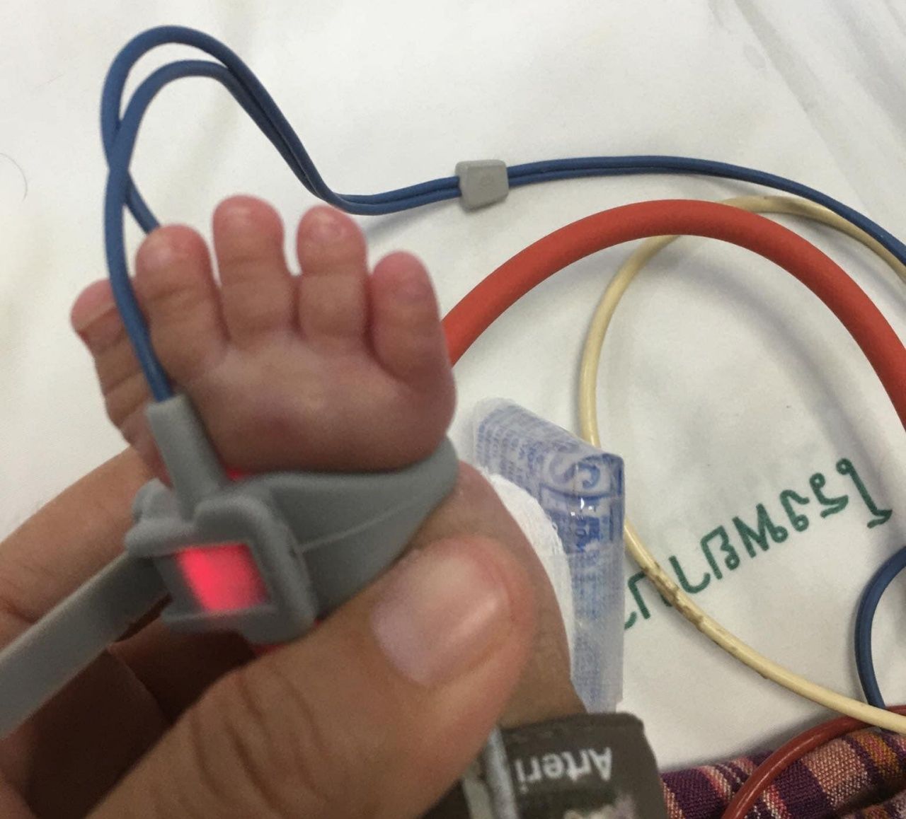 วันที่เกิดเหตุ ตนให้พี่สาวไปเยี่ยมลูก เมื่อไปถึงเห็นว่าน้องร้องไห้งอแงตลอดเวลา จึงพยายามมองว่า มีอะไรหรือเปล่า กระทั่งเห็นสายรัดที่ฝ่าเท้า จึงบอกให้พยาบาลมาช่วยปลดสายรัดให้หน่อย แต่พยาบาลบอกว่า ต้องรัดให้แน่น เพราะต้องจับชีพจรน้อง แต่เพราะสายรัดเท้าน้องจนบวมแดง พี่สาวจึงขอให้เอาออก พอเอาออก ก็เป็นไปตามภาพ
