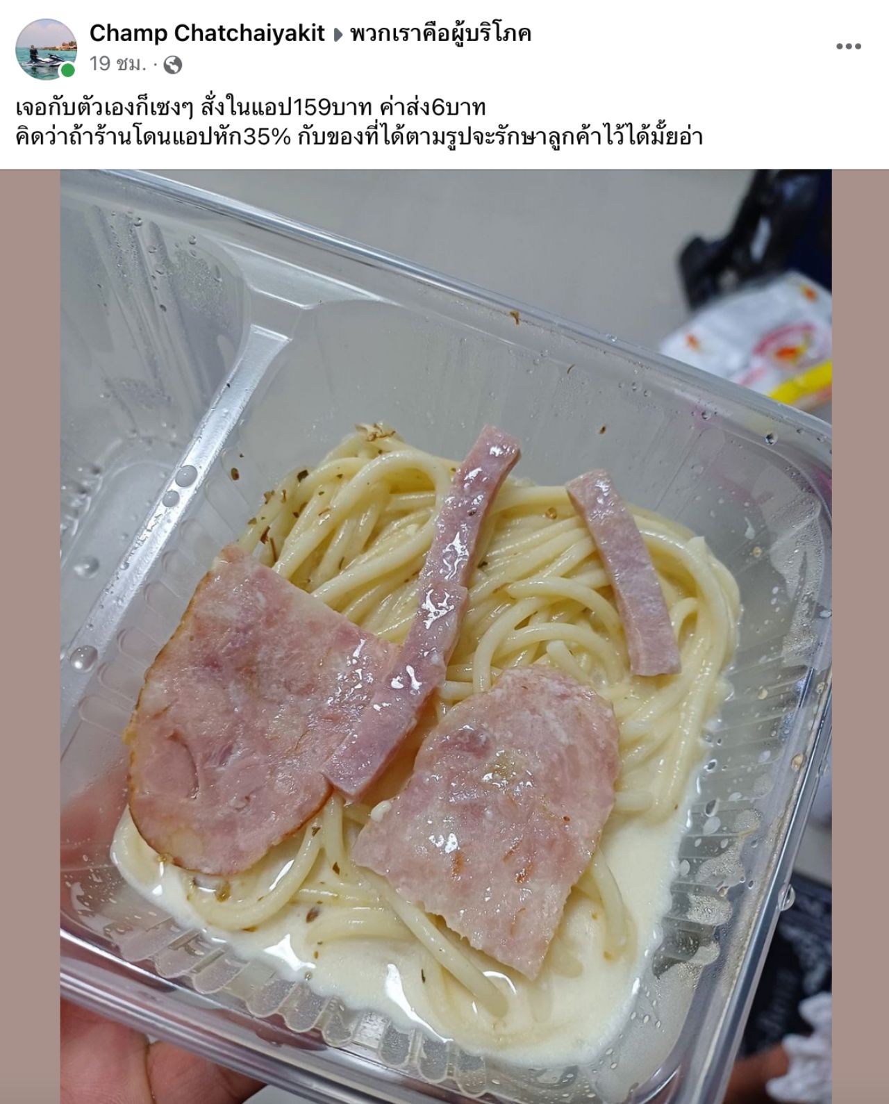 ขณะที่ "คุณแชมป์" เจ้าของโพสต์ดังกล่าว เล่าข้อมูลเพิ่มเติมให้ "ทีมข่าวไทยรัฐออนไลน์" ฟังว่า "เพิ่งเคยสั่งร้านนี้ครั้งแรก ลูกสาวชอบทานสปาเกตตีคาโบนาร่า ก็ลองหาในแอปฯ เห็นว่าร้านนี้ภาพที่ลงน่าทานดีและค่าส่งไม่แพง ตอนแรกร้านแยกเส้นมาในกล่อง กับซอสมาในถุงร้อนซีลปิด พอแกะราดลงบนเส้นก็ตกใจได้เท่านี้จริงๆ เหรอ เพราะส่วนตัวเคยซื้อแฮมแบบนี้มาทำอาหารซึ่งต้นทุนมันไม่กี่บาทเอง แถมเส้นสปาเกตตีก็ยังมีเหลืออยู่ในตู้เย็นด้วย แต่ขี้เกียจทำเอง