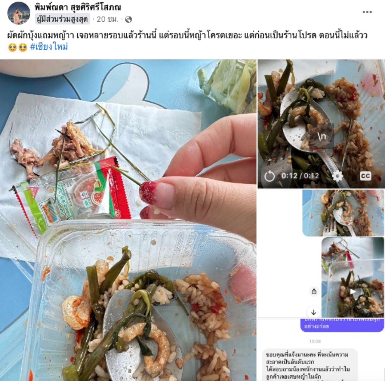 โดยระบุข้อความว่า ผัดผักบุ้งแถมหญ้า เจอหลายรอบแล้วร้านนี้ แต่รอบนี้หญ้าโคตรเยอะ แต่ก่อนเป็นร้านโปรด ตอนนี้ไม่แล้วว #เชียงใหม่