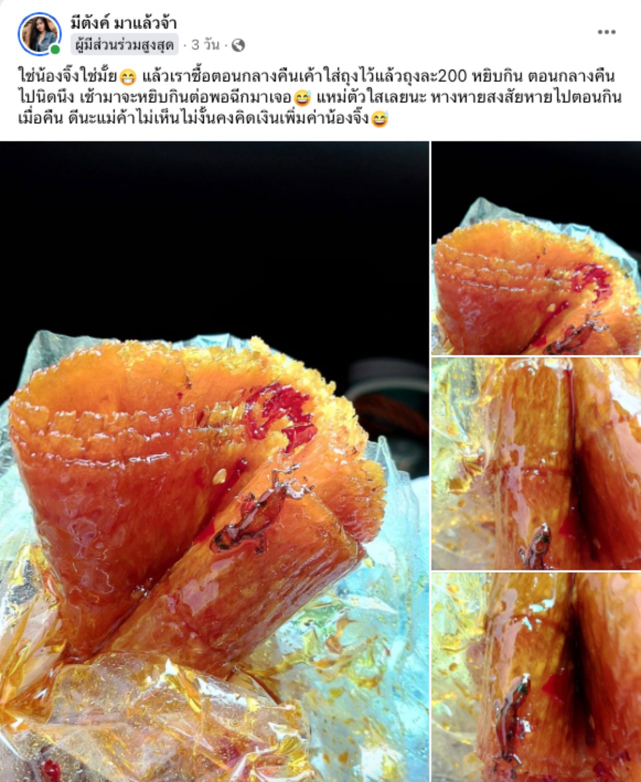 กลายเป็นเรื่องราวที่ถูกพูดถึงในโลกออนไลน์ เมื่อผู้ใช้เฟซบุ๊ก มีตังค์ มาแล้วจ้า ได้โพสต์ภาพพร้อมข้อความผ่านกลุ่ม พวกเราคือผู้บริโภค โดยระบุว่า "ใช่น้องจิ้งใช่มั้ย แล้วเราซื้อตอนกลางคืนเค้าใส่ถุงไว้แล้วถุงละ 200 หยิบกินตอนกลางคืนไปนิดนึง เช้ามาจะหยิบกินต่อ พอฉีกมาเจอ แหม ตัวใสเลยนะ หางหายสงสัยหายไปตอนกินเมื่อคืน ดีนะแม่ค้าไม่เห็น ไม่งั้นคงคิดเงินเพิ่มค่าน้องจิ้ง"