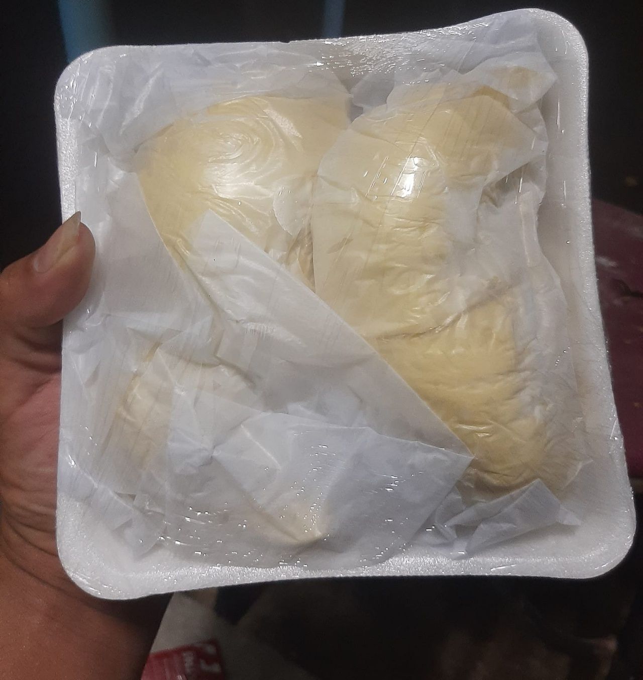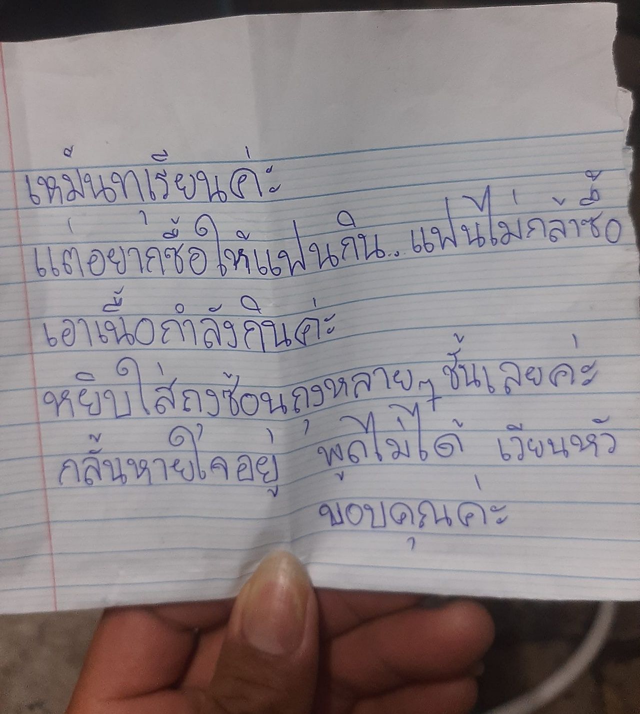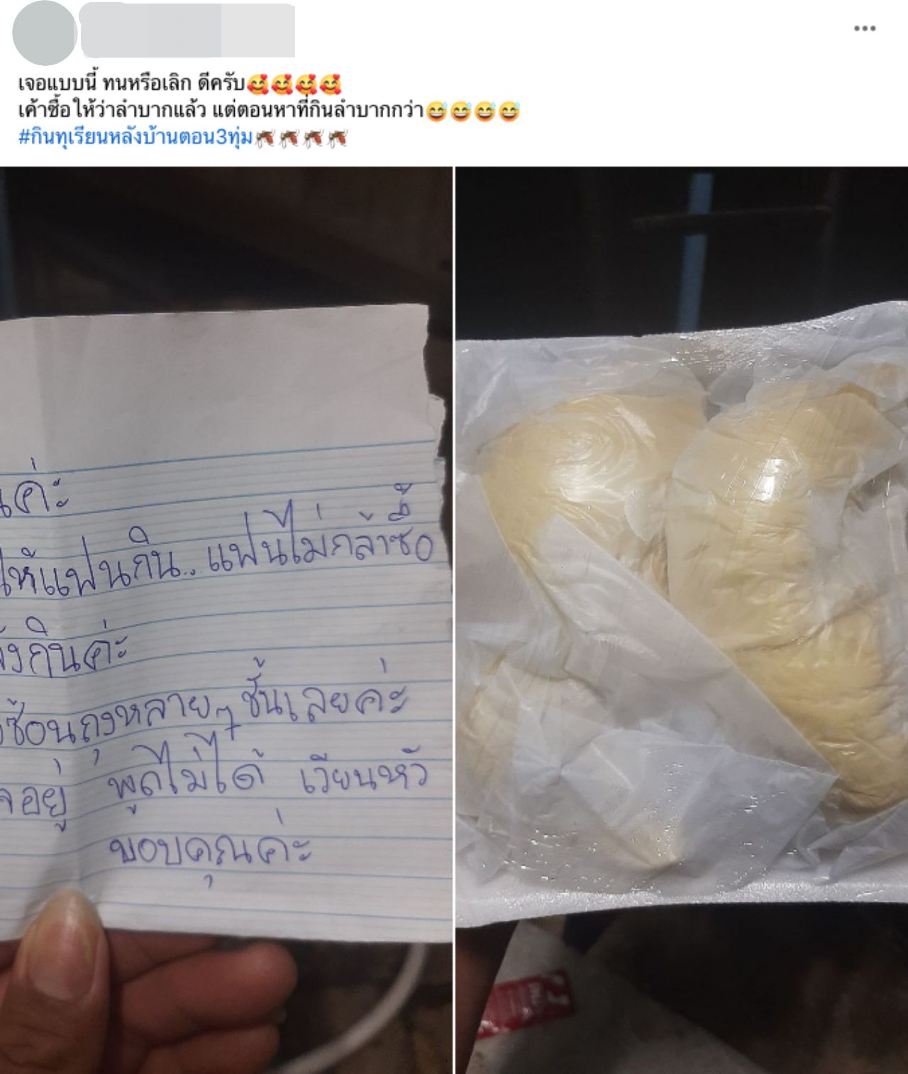 พร้อมกับเผยภาพทุเรียน และกระดาษที่แฟนเขียนให้กับแม่ค้าว่า "เหม็นทุเรียนค่ะ แต่อยากซื้อให้แฟนกิน...แฟนไม่กล้าซื้อ เอาเนื้อกำลังกินค่ะ หยิบใส่ถุงซ้อนถุงหลายๆ ชั้นเลยค่ะ กลั้นหายใจอยู่ พูดไม่ได้ เวียนหัว ขอบคุณ"