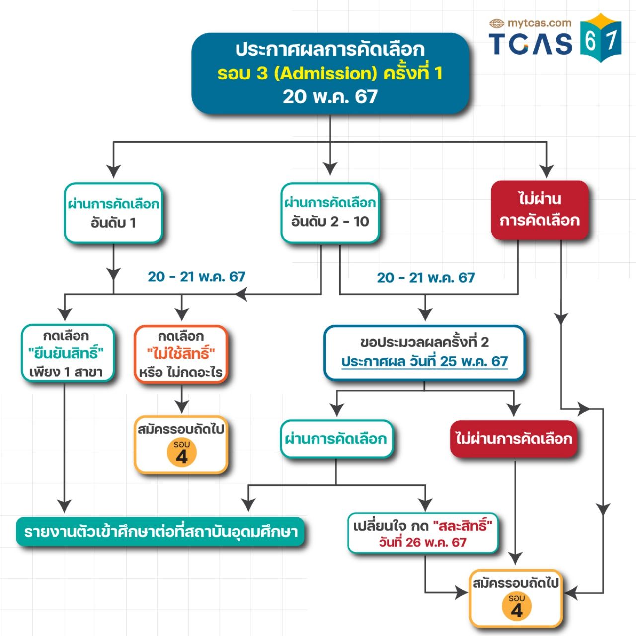 วันที่ 20 พฤษภาคม 2567 ผู้สื่อข่าวรายงานว่า เรียกได้ว่าเป็นช่วงเวลาที่ Dek67 หลายคนต่างรอคอยหลังจากได้ยื่นสมัคร TCAS รอบที่ 3 Admission ระดับปริญญาตรี ปีการศึกษา 2567 ซึ่งได้มีการประกาศผลในระบบครั้งที่ 1 วันนี้ โดยสามารถเช็กได้เว็บไซต์ https://student.mytcas.com/ หรือ (คลิกที่นี่)