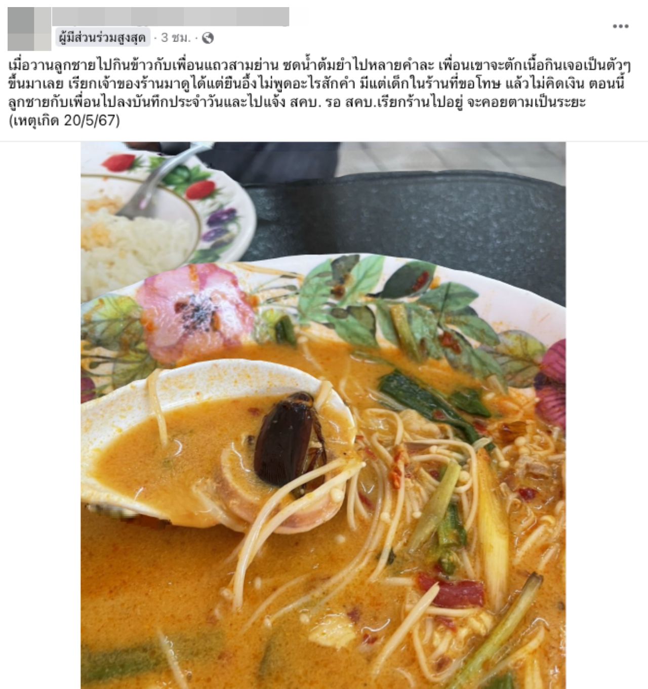 กลายเป็นเรื่องราวที่ถูกพูดถึงในโลกออนไลน์ เมื่อผู้ใช้เฟซบุ๊กรายหนึ่ง ได้โพสต์ภาพพร้อมข้อความผ่านกลุ่ม พวกเราคือผู้บริโภค พร้อมระบุว่า "เมื่อวานลูกชายไปกินข้าวกับเพื่อนแถวสามย่าน ซดน้ำต้มยำไปหลายคำละ เพื่อนเขาจะตักเนื้อกินเจอเป็นตัวๆ ขึ้นมาเลย เรียกเจ้าของร้านมาดูได้แต่ยืนอึ้ง ไม่พูดอะไรสักคำ มีแต่เด็กในร้านที่ขอโทษ แล้วไม่คิดเงิน ตอนนี้ลูกชายกับเพื่อนไปลงบันทึกประจำวันและไปแจ้ง สคบ. รอ สคบ.เรียกร้านไปอยู่ จะคอยตามเป็นระยะ เหตุเกิด 20/5/67"